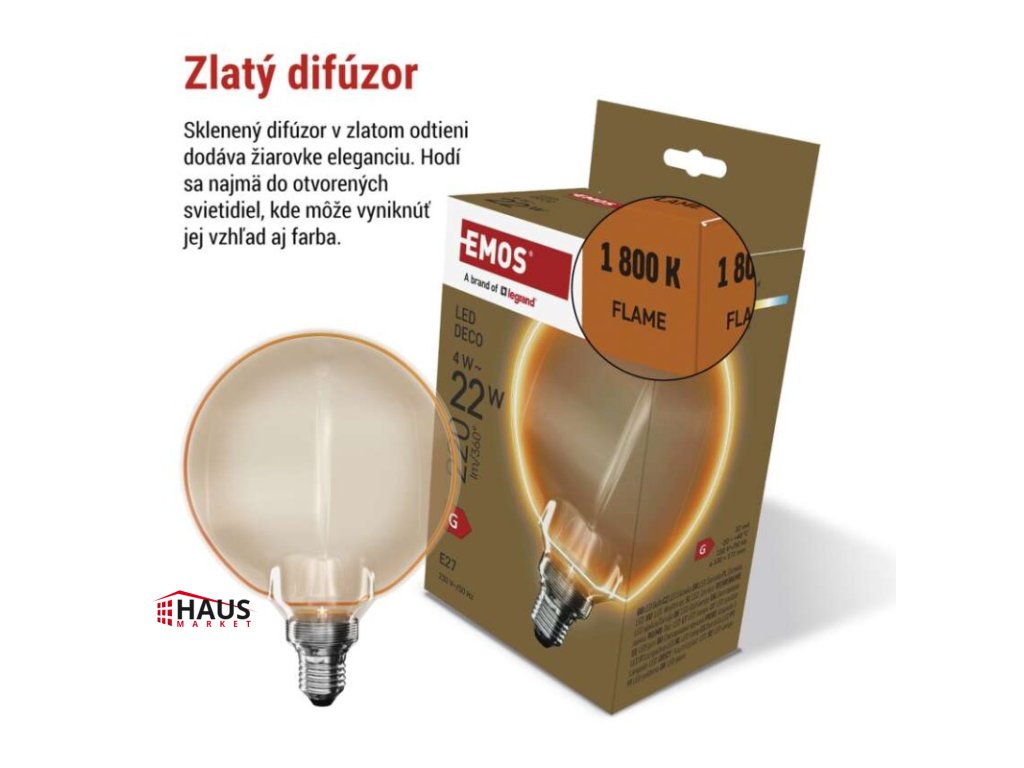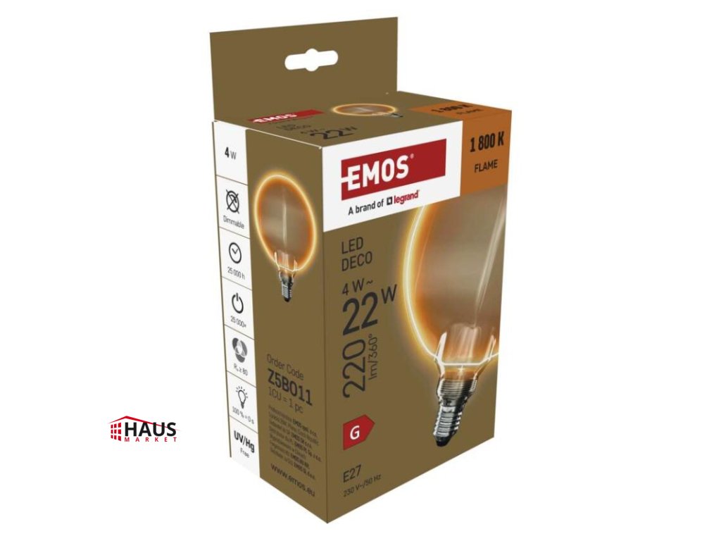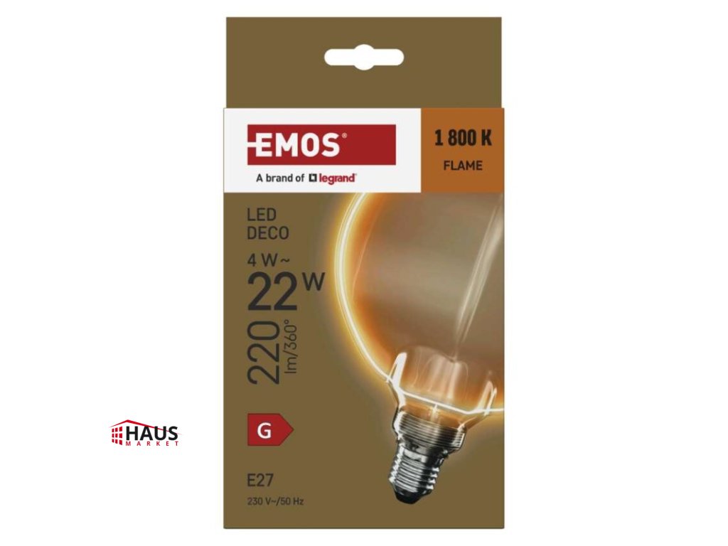 energetická trieda: G|farba svetla: Flame|index podania farieb (CRI): Ra >80|kompatibilita: neuvádza sa|náhrada za žiarovku: 22 W|napätie: 230 V~/50 Hz|notifikácie do mobilnej aplikácie: neuvádza sa|ovládanie hlasovými asistentmi: neuvádza sa|pätica (uchytenie žiarovky): E27|počet čipov: neuvádza sa|počet spínacích cyklov: 25 000|podporované OS: neuvádza sa|predajný obal: 1 ks, krabička|prenosová frekvencia: neuvádza sa|príkon: 4 W|protokol: neuvádza sa|rada: DECO|rozmer: 130 × 80 × 171 mm|stmievateľná: nie|svetelná účinnosť: 55 lm/W|svetelný tok: 220 lm|technológia: LED|teplota chromatičnosti: 1 800 K|tvar: G130OA|typ čipov: COB|účinník: 0,40|uhol vyžarovania: 330°|záručná doba: 2 roky|životnosť: 25 000 hodínDodatočné parametre