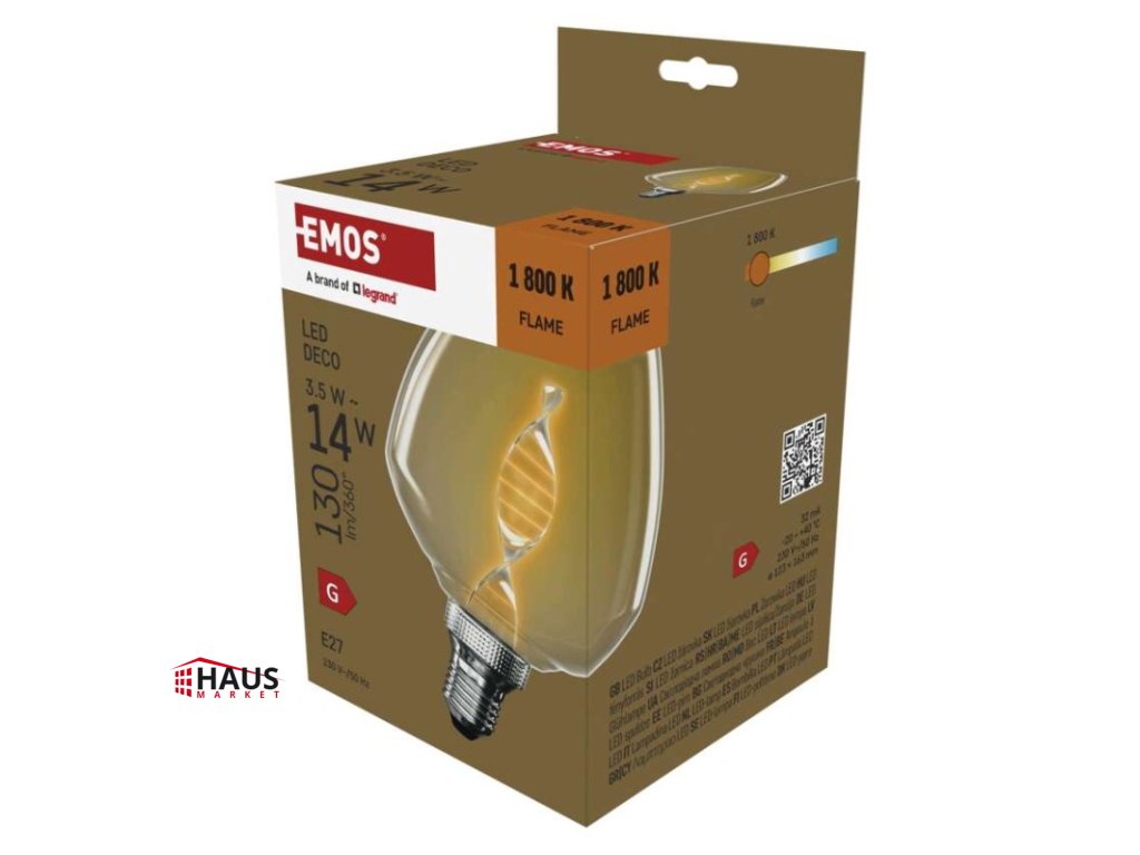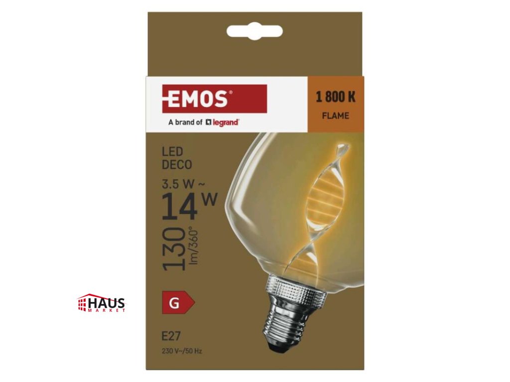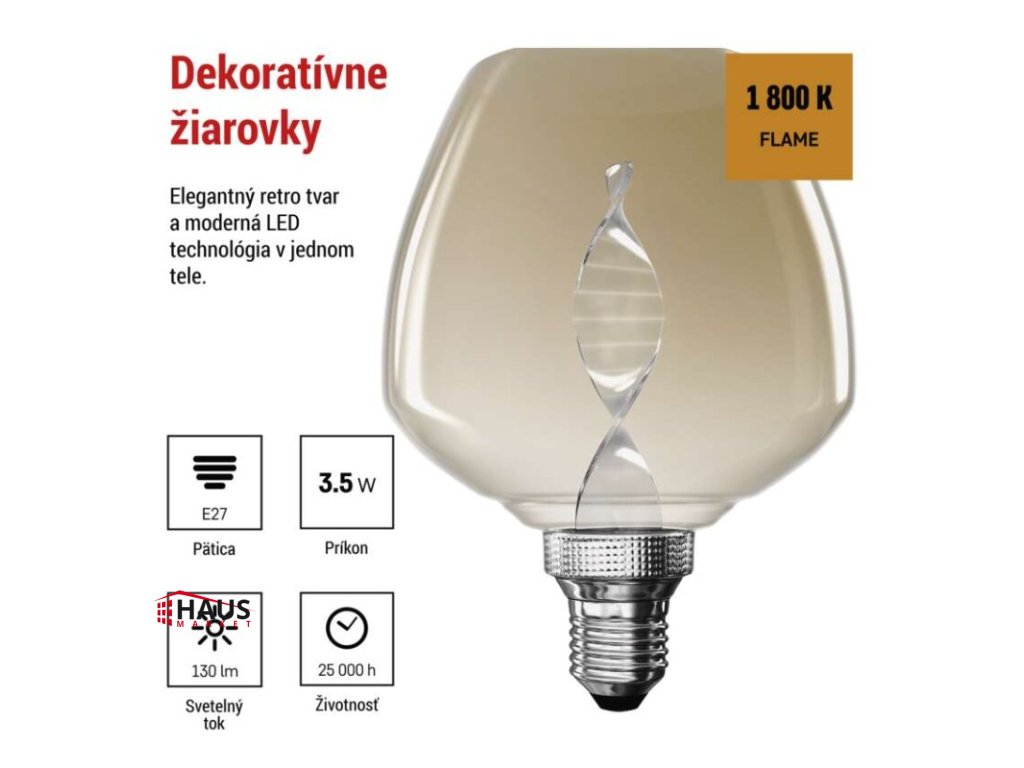 energetická trieda: G|farba svetla: Flame|index podania farieb (CRI): Ra >80|kompatibilita: neuvádza sa|náhrada za žiarovku: 14 W|napätie: 230 V~/50 Hz|notifikácie do mobilnej aplikácie: neuvádza sa|ovládanie hlasovými asistentmi: neuvádza sa|pätica (uchytenie žiarovky): E27|počet čipov: neuvádza sa|počet spínacích cyklov: 25 000|podporované OS: neuvádza sa|predajný obal: 1 ks, krabička|prenosová frekvencia: neuvádza sa|príkon: 3,5 W|protokol: neuvádza sa|rada: DECO|rozmer: 126 × 126 × 163 mm|stmievateľná: nie|svetelná účinnosť: 37 lm/W|svetelný tok: 130 lm|technológia: LED|teplota chromatičnosti: 1 800 K|tvar: S123|typ čipov: COB|účinník: 0,40|uhol vyžarovania: 330°|záručná doba: 2 roky|životnosť: 25 000 hodínDodatočné parametre