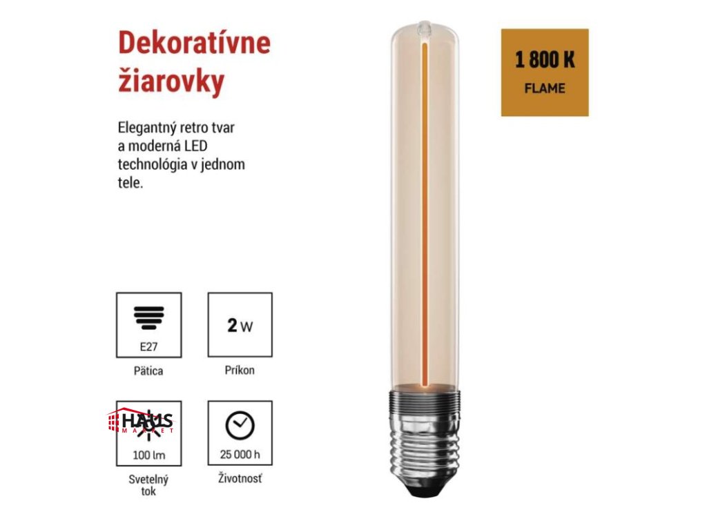 energetická trieda: G|farba svetla: Flame|index podania farieb (CRI): Ra >80|kompatibilita: neuvádza sa|náhrada za žiarovku: 11 W|napätie: 230 V~/50 Hz|notifikácie do mobilnej aplikácie: neuvádza sa|ovládanie hlasovými asistentmi: neuvádza sa|pätica (uchytenie žiarovky): E27|počet čipov: neuvádza sa|počet spínacích cyklov: 25 000|podporované OS: neuvádza sa|predajný obal: 1 ks, krabička|prenosová frekvencia: neuvádza sa|príkon: 2 W|protokol: neuvádza sa|rada: DECO|rozmer: 30 × 30 × 187 mm|stmievateľná: nie|svetelná účinnosť: 50 lm/W|svetelný tok: 100 lm|technológia: LED|teplota chromatičnosti: 1 800 K|tvar: T30|typ čipov: COB|účinník: 0,40|uhol vyžarovania: 330°|záručná doba: 2 roky|životnosť: 25 000 hodínDodatočné parametre
