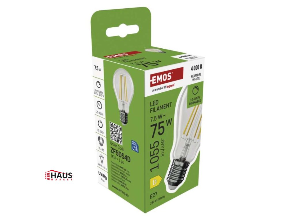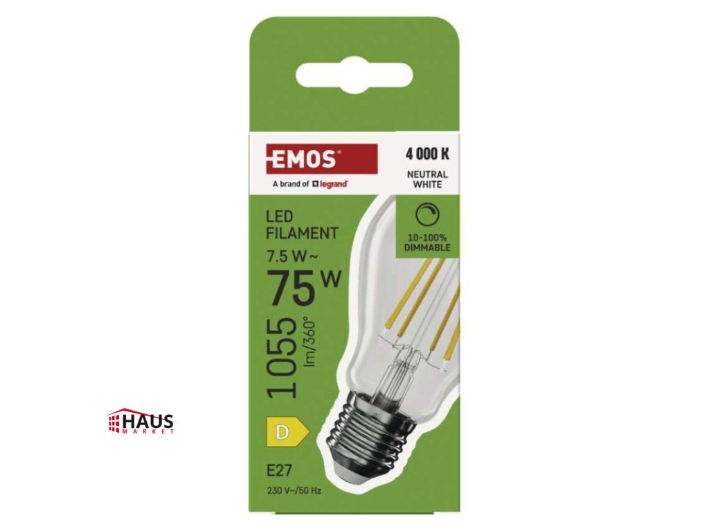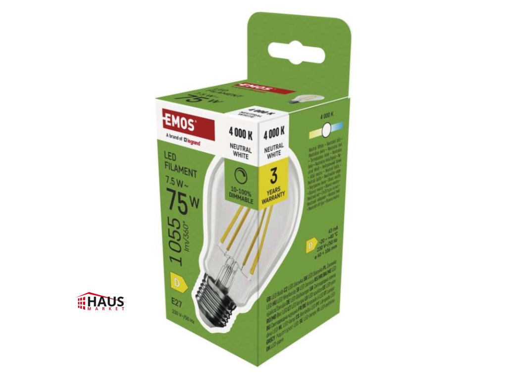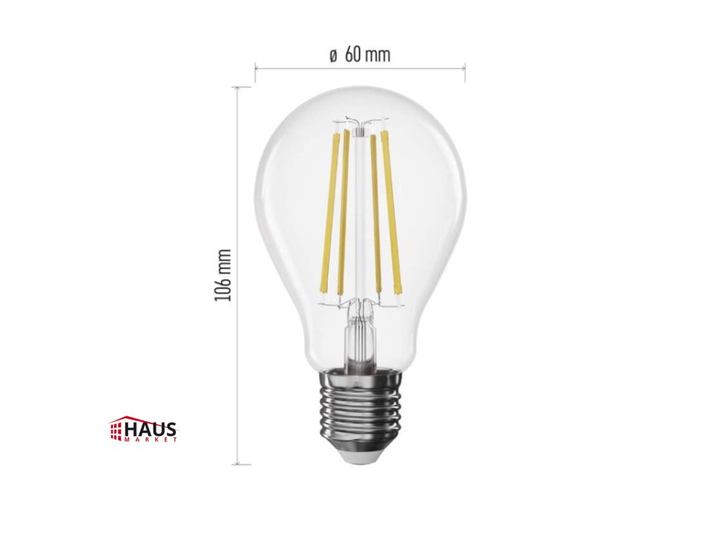 energetická trieda: D|farba svetla: neutrálna biela|index podania farieb (CRI): Ra >80|kompatibilita: neuvádza sa|náhrada za žiarovku: 75 W|napätie: 230 V~/50 Hz|notifikácie do mobilnej aplikácie: neuvádza sa|ovládanie hlasovými asistentmi: neuvádza sa|pätica (uchytenie žiarovky): E27|počet čipov: neuvádza sa|počet spínacích cyklov: 25 000|podporované OS: neuvádza sa|predajný obal: 1 ks, krabička|prenosová frekvencia: neuvádza sa|príkon: 7,5 W|protokol: neuvádza sa|rada: FILAMENT|rozmer: 60 × 60 × 106 mm|stmievateľná: áno|svetelná účinnosť: 141 lm/W|svetelný tok: 1 055 lm|technológia: LED|teplota chromatičnosti: 4 000 K|tvar: A60|typ čipov: COB|účinník: 0,73|uhol vyžarovania: 320°|záručná doba: 3 roky|životnosť: 25 000 hodínDodatočné parametre