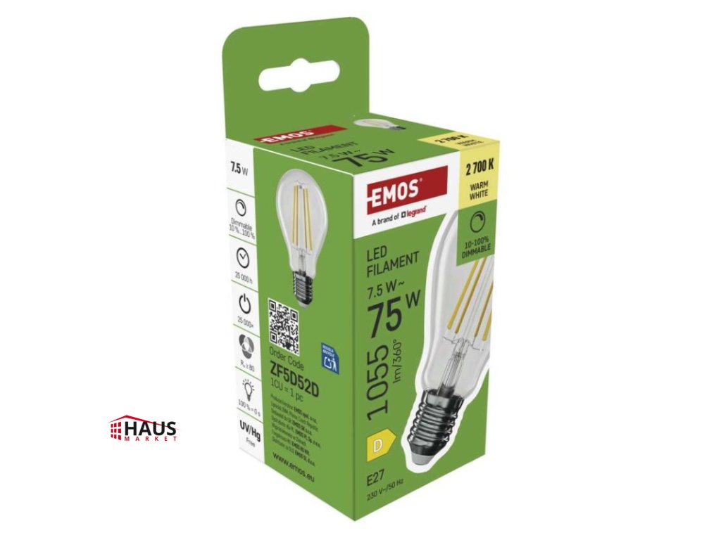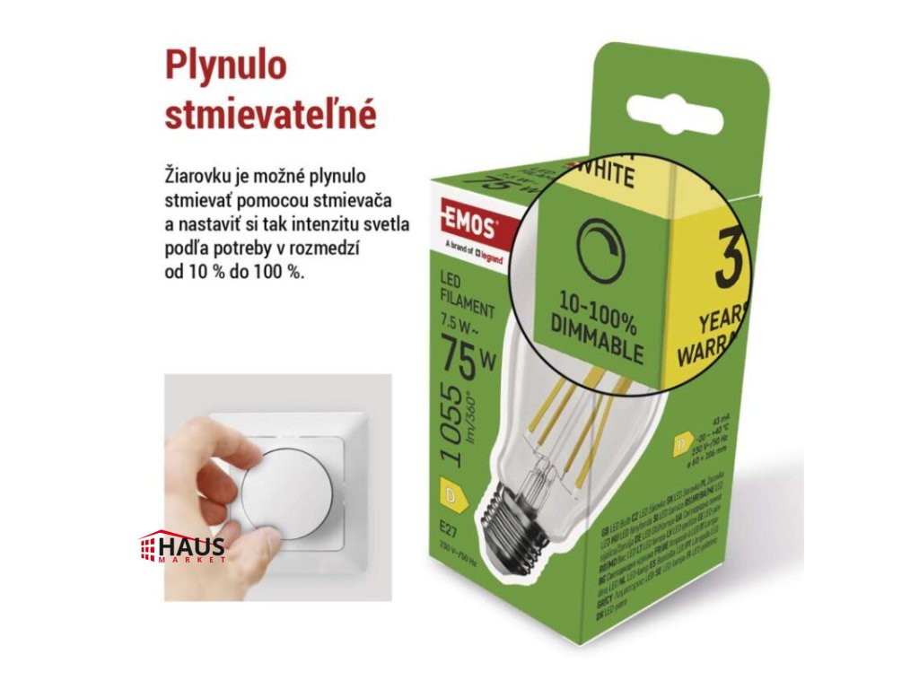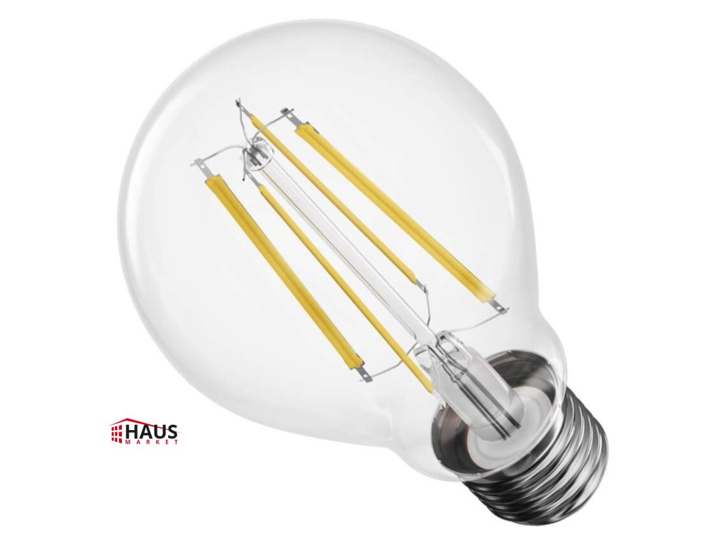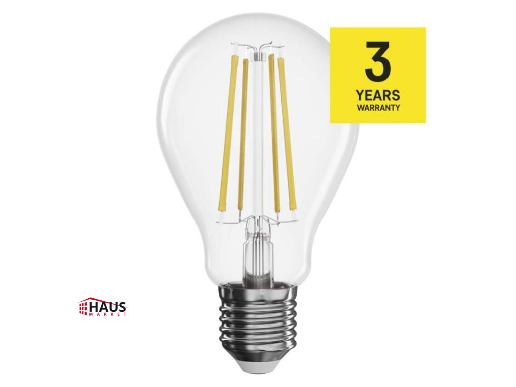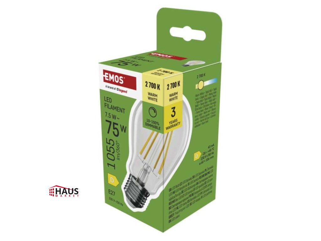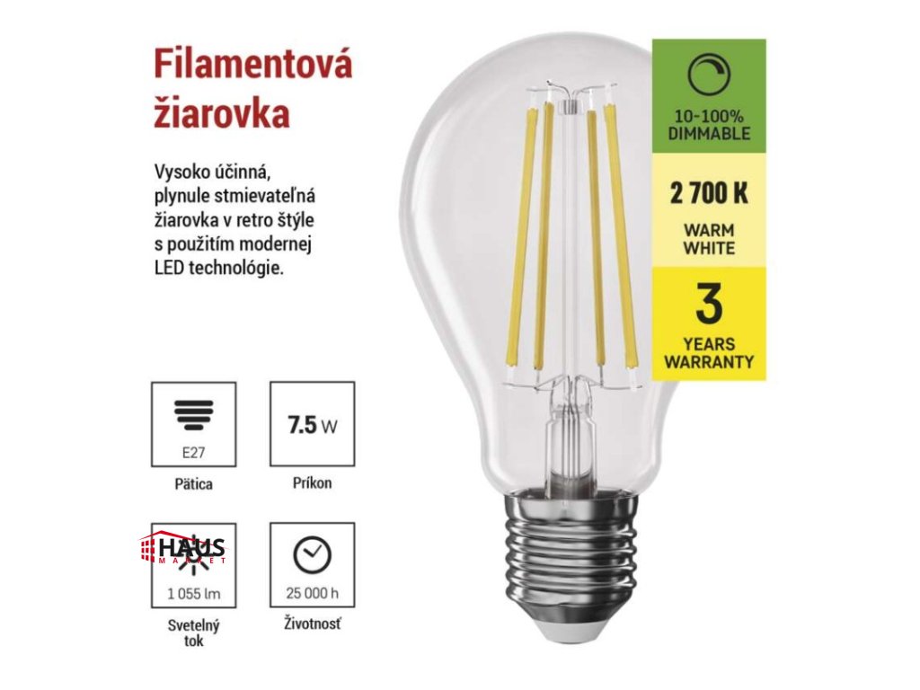 energetická trieda: D|farba svetla: teplá biela|index podania farieb (CRI): Ra >80|kompatibilita: neuvádza sa|náhrada za žiarovku: 75 W|napätie: 230 V~/50 Hz|notifikácie do mobilnej aplikácie: neuvádza sa|ovládanie hlasovými asistentmi: neuvádza sa|pätica (uchytenie žiarovky): E27|počet čipov: neuvádza sa|počet spínacích cyklov: 25 000|podporované OS: neuvádza sa|predajný obal: 1 ks, krabička|prenosová frekvencia: neuvádza sa|príkon: 7,5 W|protokol: neuvádza sa|rada: FILAMENT|rozmer: 60 × 60 × 106 mm|stmievateľná: áno|svetelná účinnosť: 141 lm/W|svetelný tok: 1 055 lm|technológia: LED|teplota chromatičnosti: 2 700 K|tvar: A60|typ čipov: COB|účinník: 0,73|uhol vyžarovania: 320°|záručná doba: 3 roky|životnosť: 25 000 hodínDodatočné parametre