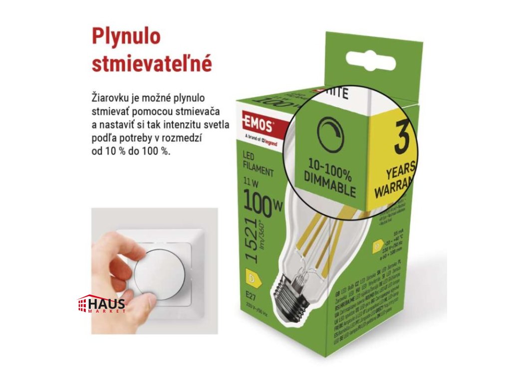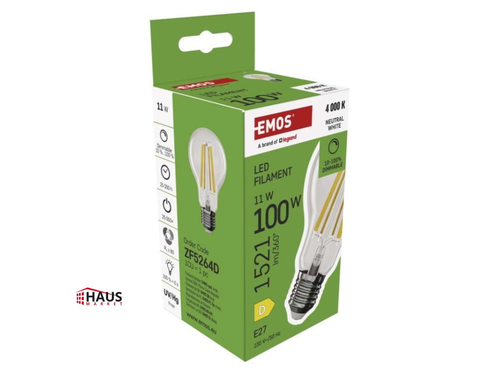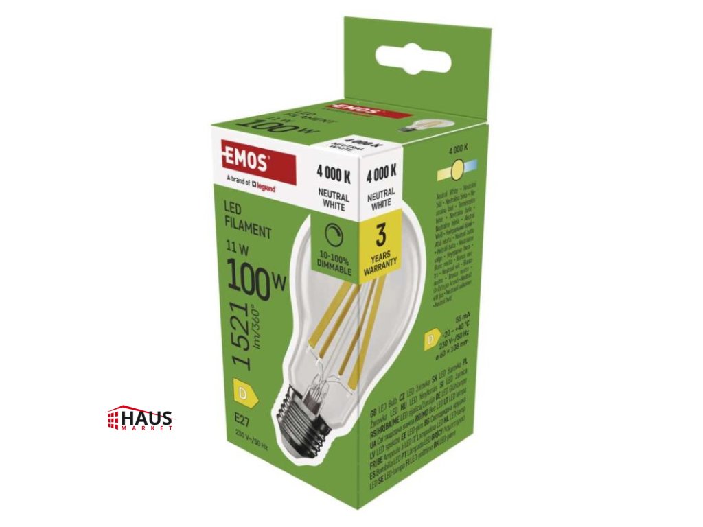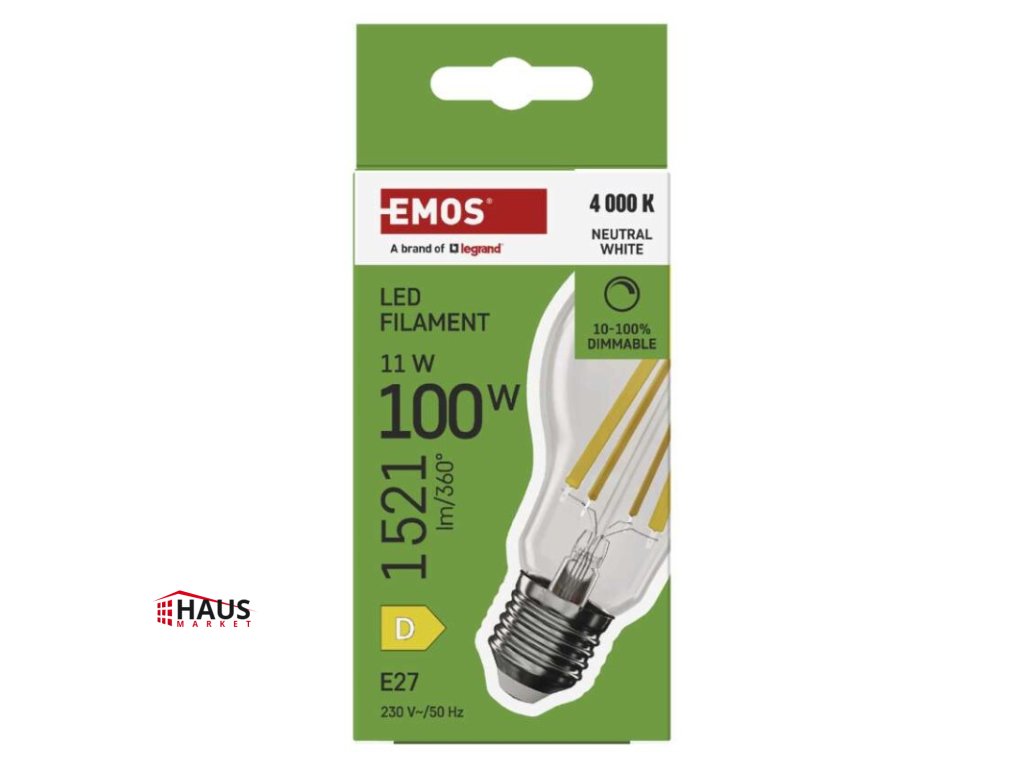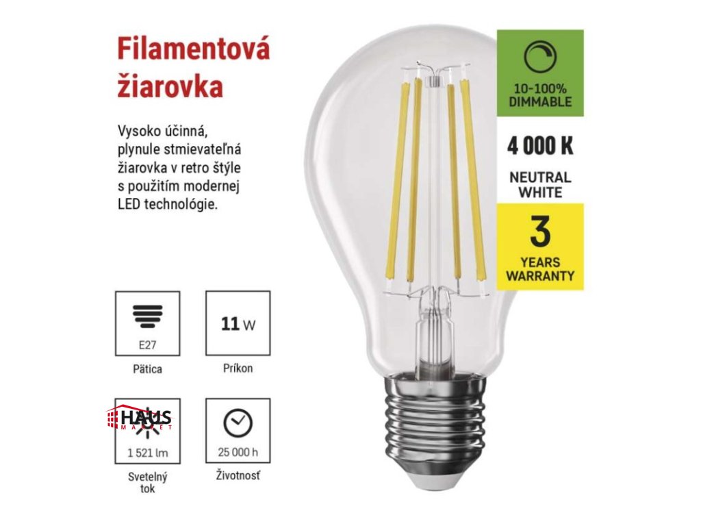 energetická trieda: D|farba svetla: neutrálna biela|index podania farieb (CRI): Ra >80|kompatibilita: –|náhrada za žiarovku: 100 W|napätie: 230 V~/50 Hz|notifikácie do mobilnej aplikácie: –|ovládanie hlasovými asistentmi: –|pätica (uchytenie žiarovky): E27|počet čipov: neuvádza sa|počet spínacích cyklov: 25 000|podporované OS: –|predajný obal: 1 ks, krabička|prenosová frekvencia: –|príkon: 11 W|protokol: –|rada: FILAMENT|rozmer: 60 × 60 × 108 mm|stmievateľná: áno|svetelná účinnosť: 138 lm/W|svetelný tok: 1 521 lm|technológia: LED|teplota chromatičnosti: 4 000 K|tvar: A60|typ čipov: COB|účinník: 0,95|uhol vyžarovania: 320°|záručná doba: 3 roky|životnosť: 25 000 hodínDodatočné parametre