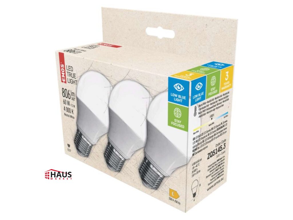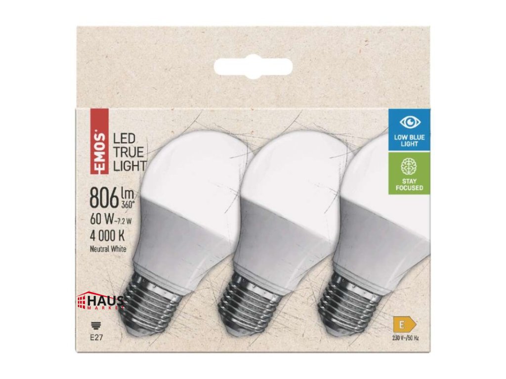 energetická trieda: E|farba svetla: neutrálna biela|index podania farieb (CRI): Ra >94|kompatibilita: –|náhrada za žiarovku: 60 W|napätie: 230 V~/50 Hz|notifikácie do mobilnej aplikácie: –|ovládanie hlasovými asistentmi: –|pätica (uchytenie žiarovky): E27|počet čipov: 20|počet spínacích cyklov: 25 000|podporované OS: –|predajný obal: 3 ks, krabička|prenosová frekvencia: –|príkon: 7,2 W|protokol: –|rada: TRUE LIGHT|rozmer: 102 × 60 × 60 mm|stmievateľná: nie|svetelná účinnosť: 112 lm/W|svetelný tok: 806 lm|technológia: LED|teplota chromatičnosti: 4 000 K|tvar: A60|typ čipov: SMD|účinník: 0.60|uhol vyžarovania: 180°|záručná doba: 3 roky|životnosť: 30 000 hodínDodatočné parametre