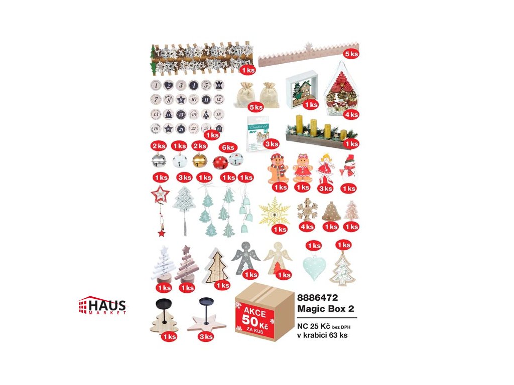 Vianočný Magic BOX. Box obsahuje 63 ks rôznych vianočných ozdôb. Nájdete tu napr. vianočné ozdoby na zavesenie, postavenie ale aj na okno. Dekorácie sú z rôznych materiálov ako je drevo, plast, papier, kov, betón ai. Široká škála vianočných ozdôb zaručí, že budete mať všetko, čo potrebujete na výzdobu Vášho domova. V prípade vypredania niektorého z produktov môže byť nahradený iným. BALENIE OBSAHUJE: - 63 ks ozdôb Všetkých 63 ks je balených v kartónovej krabici. Dodávame iba ako celok 63 ks. Uvedená cena je za 1 ks.Dodatočné parametre
