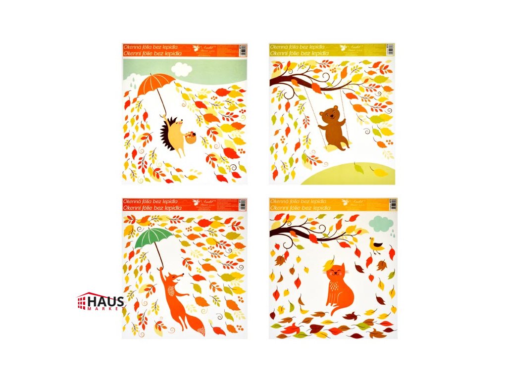 Okenné fólie jesenné zvieratká - ježko, medveď, líška, mačka. Vyzdobte si okno týmito krásnymi samolepkami na okno. Vytvorí Vám kúzelnú atmosféru domova. Na plochu priľnú elektrostaticky a nezanechávajú teda po sebe žiadnu stopu. NÁVOD: 1. Zlúpnite z podložky obrázok a umiestnite na čisté, prípadne navlhčené sklo stranou, ktorá bola na podložke. 2. Obrázok elektrostaticky priľne. 3. Fólia sa ľahko zlúpne a dá sa premiestniť. Dodávame v mixe po 4 ks podľa skladovej zásoby. Uvedená cena je za 1 ks.Dodatočné parametre