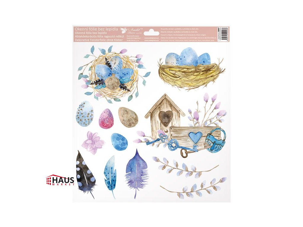 Dekoratívna okenná fólia s búdkou. Krásne okenné fólie s obrázkami vajíčok, pierok a vtáčích búdok. Na povrch sa lepia elektrostaticky, a preto nezanechávajú žiadne stopy. Vhodné na akýkoľvek hladký povrch, ako je sklo, výklady, zrkadlá alebo dlaždice. Čisté - bez lepidla - opakovane použiteľné. NÁVOD: 1. Pred použitím sa odporúča očistiť povrch od prachu a iných nečistôt. 2. Fólia sa ľahko aplikuje odstránením z podkladového papiera a umiestnením na hladký povrch. 3. Fóliu naneste a prípadné bubliny vyhlaďte rukou alebo suchou handričkou. 4. Po použití ich možno umiestniť na pôvodný podkladový papier a uskladniť na ďalšiu sezónu. Dodávame v mixe 4 ks podľa skladových zásob. Uvedená cena je za 1 ks.Dodatočné parametre
