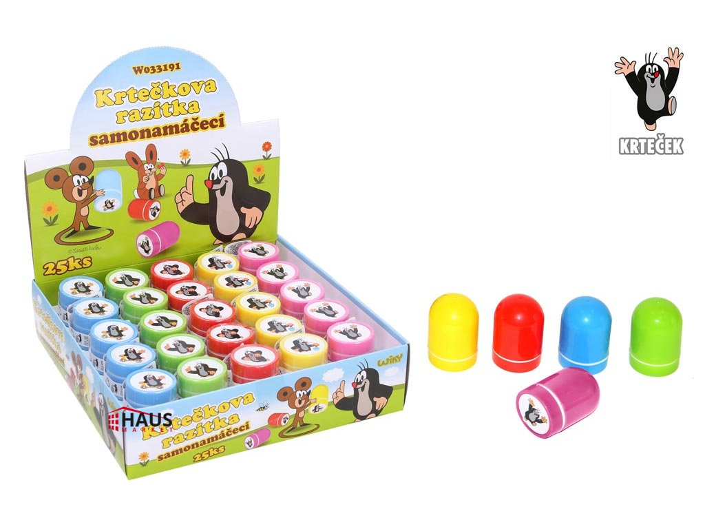 Detská samonamáčacia pečiatka Krtko, 5 farieb. Samonamáčacie uzatvárateľné pečiatky s motívom Krtka a jeho priateľov. Podporujú kreativitu a motoriku vašich detí. OBSAH BALENIA: - 25 ks pečiatok Varovanie: Slúži ako výtvarná pomôcka na potlač papiera. Používať pod dozorom dospelej osoby. Obal odstráňte z dosahu detí. Určené pre deti od 3 do 6 rokov. Všetkých 25 ks je uložených v krabičke. Dodávame v mixe 5 ks podľa skladovej zásoby. Uvedená cena je za 1 ks.Dodatočné parametre