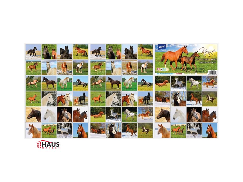 Populárna detská stolová hra pexeso pre malé deti s obrázkami koní. Hra obsahuje 32 dvojíc obrázkov veľkosti 51x51 mm. Vynikajúca učebná pomôcka pre deti aj pre rodičov. Naučte svoje deti základné anglické slovíčka a precvičujte ich pamäť. Vedeli ste, že slovo „pexeso“ vzniklo zo slov PEKELNĚ SE SOUSTŘEĎ? Návod na hru pexeso: Pexeso môžu hrať najmenej dvaja hráči. Všetky rozstrihané kartičky zamiešajú a rozložia obrázkom nadol do štvorca 8 x 8 kartičiek. Nesmú sa pri tom pozerať na obrázok. Hráči si určia poradie hry. Hráč otočí dve ľubovoľné kartičky tak, aby si aj ostatní spoluhráči mohli obrázky a ich umiestenie zapamätať. Ak kartičky nemajú rovnaké obrázky, otočí ich a vráti na pôvodné miesto. Pokračuje ďalší hráč, ktorý je na rade. Ak objaví rovnaké obrázky, získava bod a obe kartičky vyradí z hry. Pokračuje do tej chvíle, kedy otočí dva rôzne obrázky. Vyhráva hráč, ktorý získa viac bodov. Rozmer kartičky: 51x51 mm Rozměr pexesa: 3 x A4 Papier krieda matná 350g + lamino lesk 1/1. Vhodné pre deti od 3 rokov. Nebezpečenstvo vdýchnutia a prehĺtnutia malých častí.Dodatočné parametre