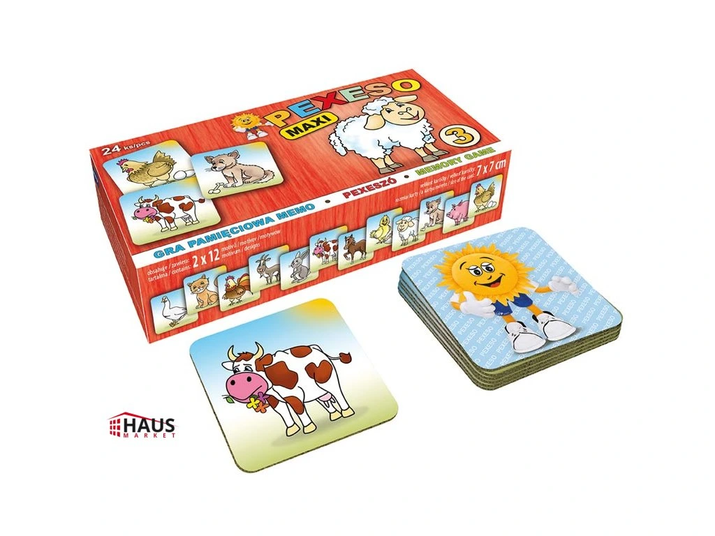 Pexeso pre malé deti s obrázkami zvierat na dvore. Táto kartová hra obsahuje 12 dvojíc obrázkov – hus, mačka, kohút, koza, krava, zajac, kôň, kuriatko, ovca, pes, prasiatko a sliepočka. Pexeso je vyrobené z 3 mm silného materiálu aby ho malé deti mohli lepšie chytiť a otočiť. Hracie kartičky sú veľké 7 x 7 cm. Výborná učebná pomôcka pre deti a rodičov. Naučte svoje deti mená zvieratiek na dvore a precvičujte ich pamäť. Vedeli ste, že slovo PEXESO vzniklo spojením slov PEKELNE SA SÚSTREĎ? https://cs.wikipedia.org/wiki/Pexeso Návod na hru pexeso: Pexeso môžu hrať najmenej dvaja hráči. Všetky rozstrihané kartičky zamiešajú a rozložia obrázkom nadol. Nesmú sa pri tom pozerať na obrázok. Hráči si určia poradie hry. Hráč otočí dve ľubovoľné kartičky tak, aby si aj ostatní spoluhráči mohli obrázky a ich umiestenie zapamätať. Ak kartičky nemajú rovnaké obrázky, otočí ich a vráti na pôvodné miesto. Pokračuje ďalší hráč, ktorý je na rade. Ak objaví rovnaké obrázky, získava bod a obe kartičky vyradí z hry. Pokračuje do tej chvíle, kedy otočí dva rôzne obrázky. Vyhráva hráč, ktorý získa viac bodov. Vhodné pre deti od 3 rokov. Nebezpečenstvo vdýchnutia a prehĺtnutia malých častí.Dodatočné parametre