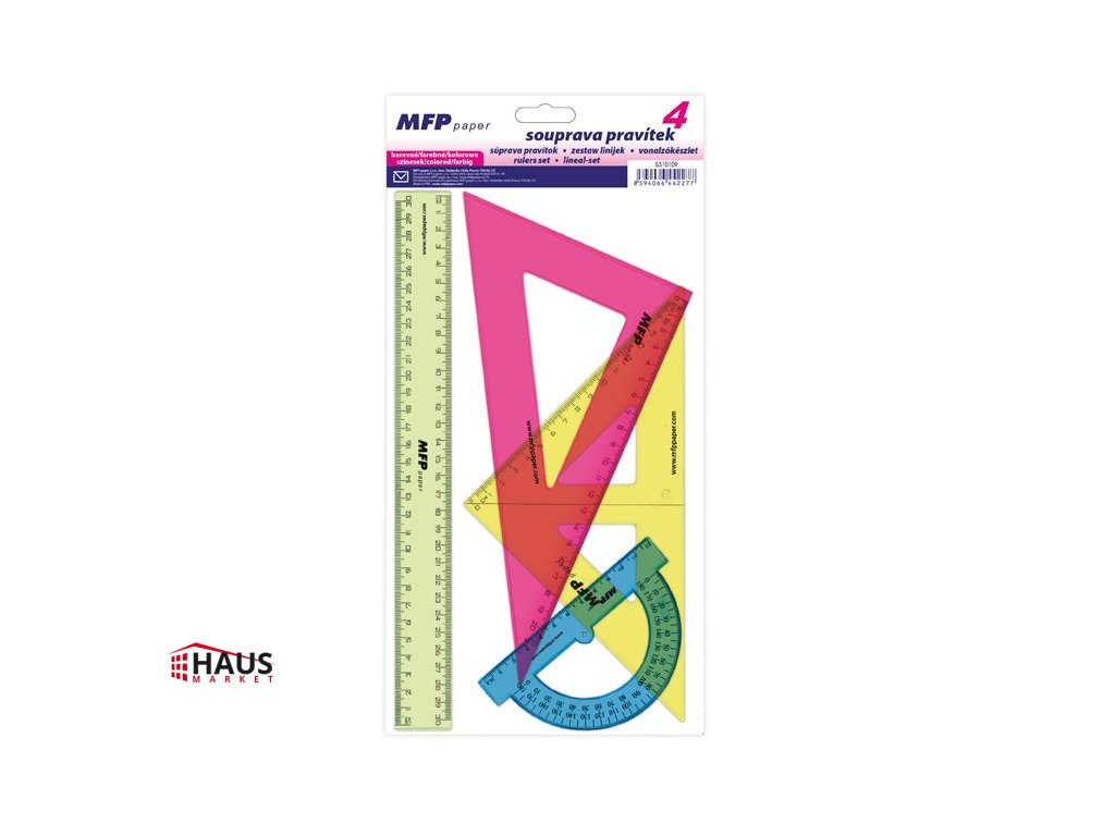 Set 4 ks rysovacích potrieb v 4 farbách - pomocník pri geometrii. BALENIE OBSAHUJE: - pravouhlý trojuholník s dĺžkou 16 cm s ryskou - rovné pravítko s dĺžkou 30 cm - trojuholník 90°/30°/60° - uhlomer Farba: ružová, modrá, zelená, žltá Pravítko je zdravotne nezávadné a neobsahuje ftaláty. Dodávame v plastovom balení so závesom. Uvedená cena je za celý set 4 druhov pravítok.Dodatočné parametre