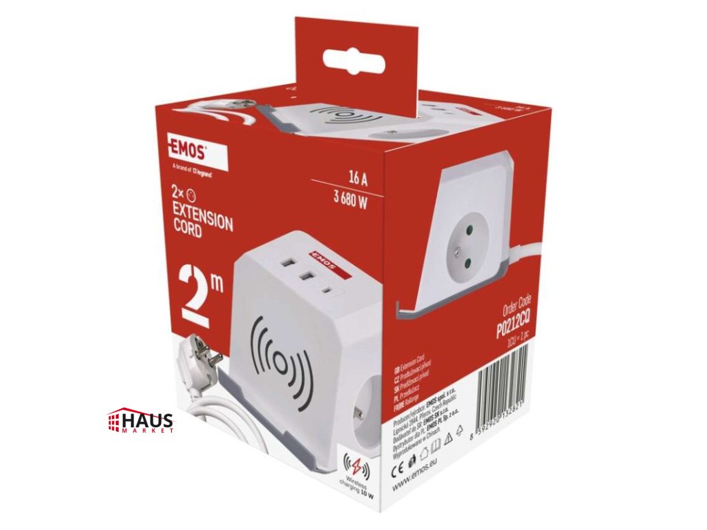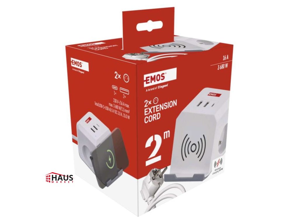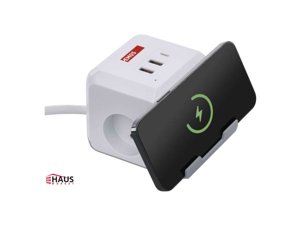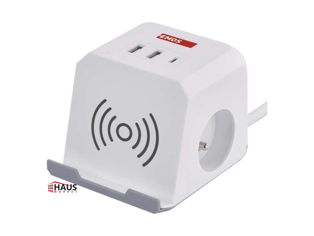 Predlžovací kábel - kocka 2 m / 2 zásuvky / biely / 2×USB-A + 1×USB-C+Qi / 1,5 mm2