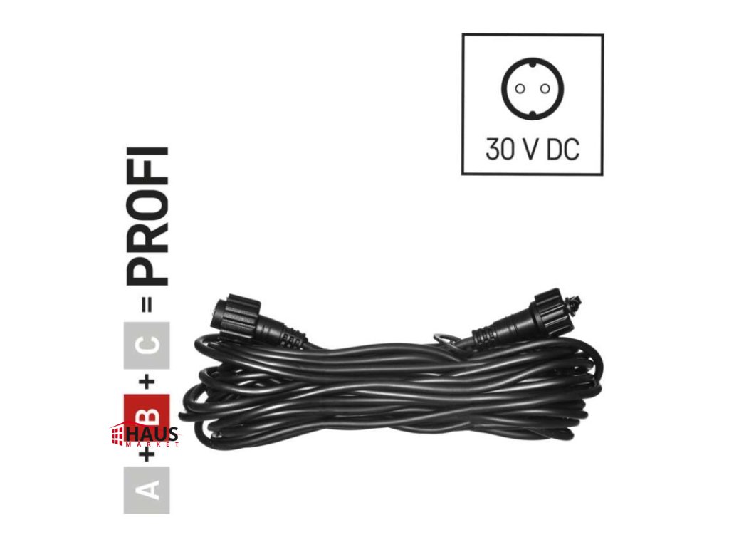 časovač: nie|diaľkový ovládač: nie|dĺžka prívodu: 10 m|farba drôtu: čierna|krytie: IP44|materiál: guma|max. počet prepojení: 500 LED|použitie: vonkajšie aj vnútorné|predajný obal: 1 ks, záves|pre rad: profi|príkon: neuvádza sa|produkt: predlžovací kábel|typ napájania: neuvádza sa|vstupné napätie: 30 V DC|výstupné napätie: neuvádza sa|záručná doba: 3 roky|životnosť: 10 000 hodínDodatočné parametre