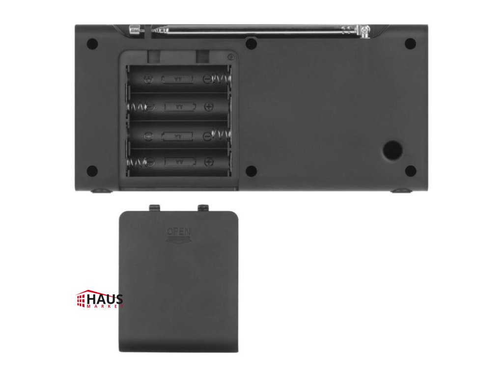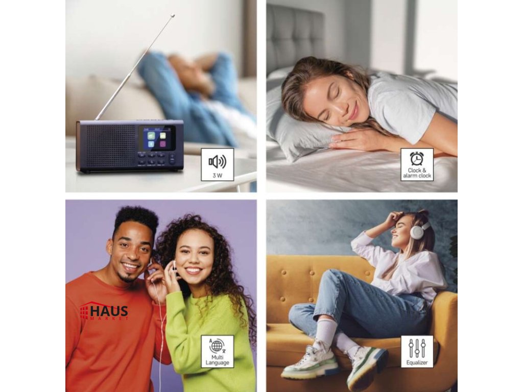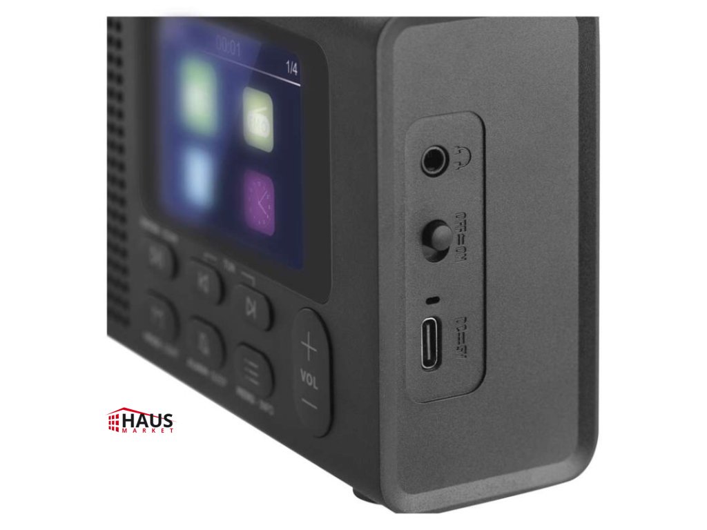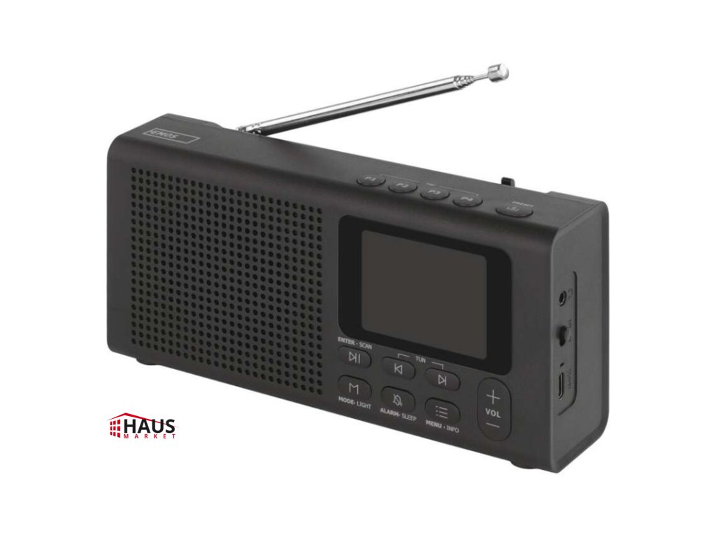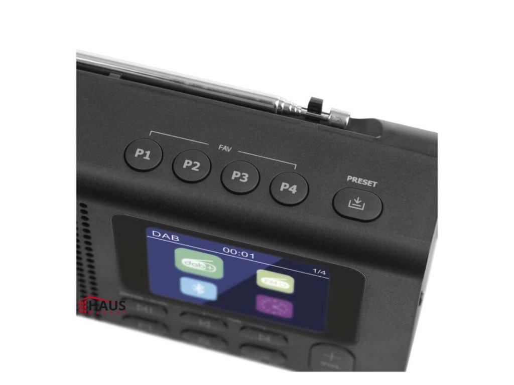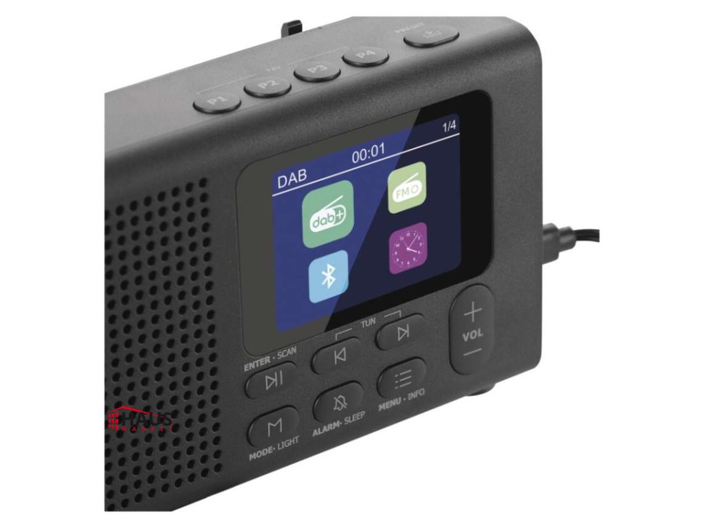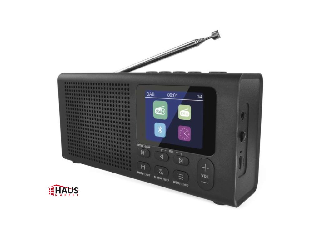 anténa: teleskopická anténa|bluetooth pre pripojenie napr. telefónu, tabletu: áno|displej: farebný displej 2,4" TFT|doba prevádzky na batériu: podľa použitých batérií|dosah bluetooth: 10 m|farba: čierna|frekvencia tunera: 87,5–108 Mhz/174,9–239,2 Mhz|frekvenčný rozsah reproduktora: neuvádza sa|funkcia budíka: áno|funkcia handsfree: nie|hmotnosť: 337 g|integrovaný mikrofón: nie|napájací zdroj súčasťou dodávky: áno|napájanie: 4× AA 1,5 V (tužka)|odstup signálu/šum: neuvádza sa|podpora MP3: nie|potlačenie signálu: neuvádza sa|predajný obal: 1 ks, krabica|rádio: DAB/DAB+/FM|reproduktor: 50 mm/4 Ohm/3 W|rozmer: 190 × 91 × 45 mm|rozsah dekodéra MP3: neuvádza sa|typ batérie: AA (tužka)|USB vstup: nie|verzia bluetooth: 5.0|vstup AUX: nie|vstup pre microSD kartu: nie|výstup na slúchadlá: ánoDodatočné parametre