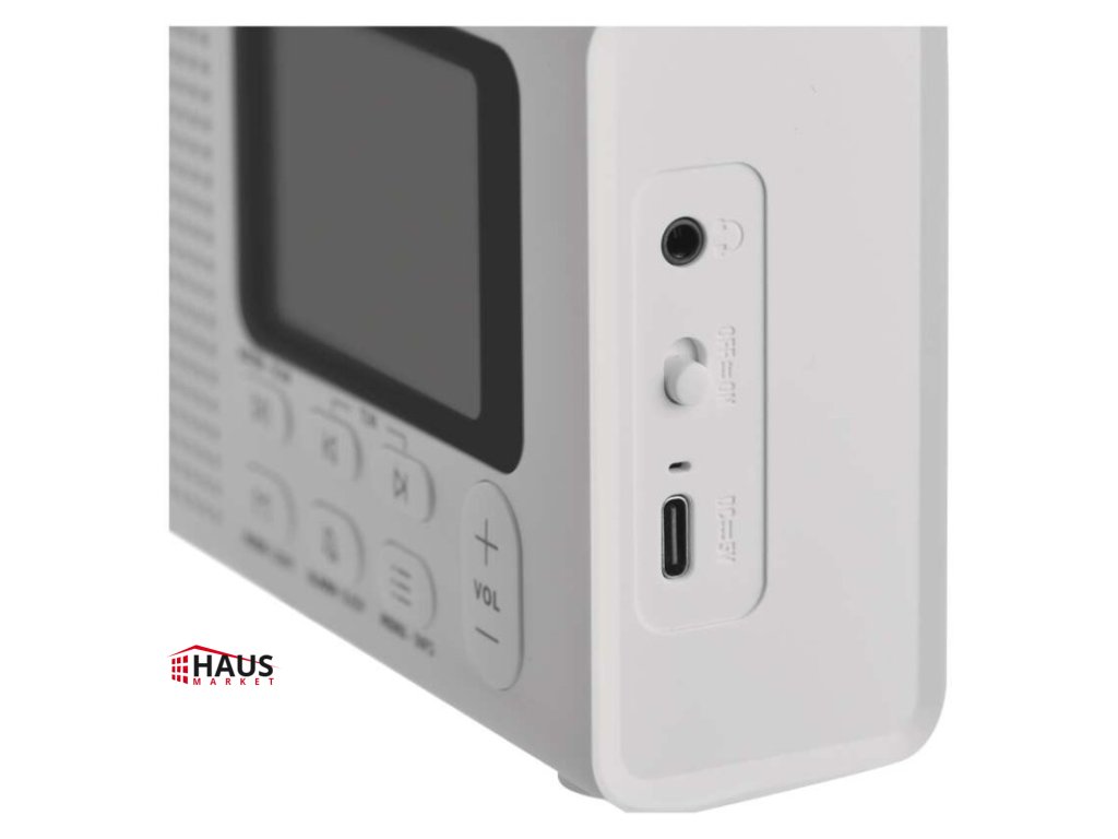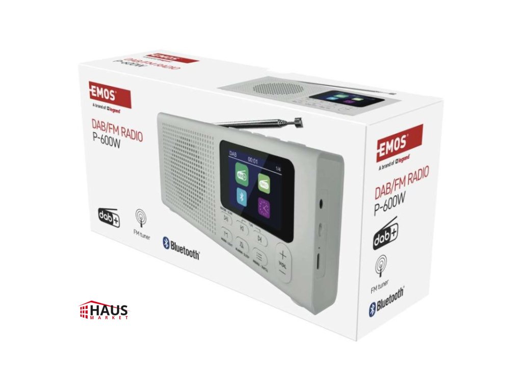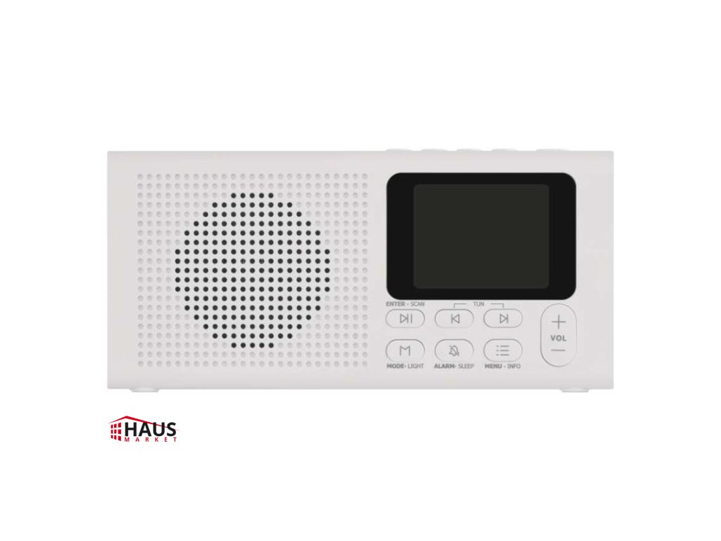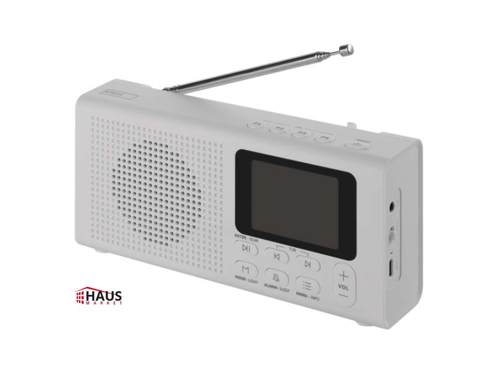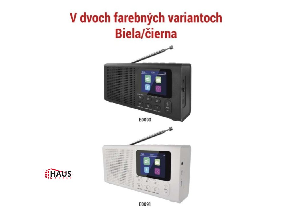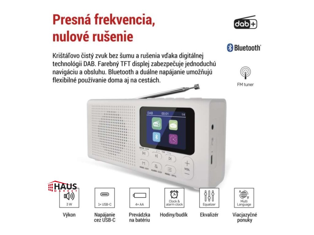 anténa: teleskopická anténa|bluetooth pre pripojenie napr. telefónu, tabletu: áno|displej: farebný displej 2,4" TFT|doba prevádzky na batériu: podľa použitých batérií|dosah bluetooth: 10 m|farba: biela|frekvencia tunera: 87,5–108 Mhz/174,9–239,2 Mhz|frekvenčný rozsah reproduktora: neuvádza sa|funkcia budíka: áno|funkcia handsfree: nie|hmotnosť: 337 g|integrovaný mikrofón: nie|napájací zdroj súčasťou dodávky: áno|napájanie: 4× AA 1,5 V (tužka)|odstup signálu/šum: neuvádza sa|podpora MP3: nie|potlačenie signálu: neuvádza sa|predajný obal: 1 ks, krabica|rádio: DAB/DAB+/FM|reproduktor: 50 mm/4 Ohm/3 W|rozmer: 190 × 91 × 45 mm|rozsah dekodéra MP3: neuvádza sa|typ batérie: AA (tužka)|USB vstup: nie|verzia bluetooth: 5.0|vstup AUX: nie|vstup pre microSD kartu: nie|výstup na slúchadlá: ánoDodatočné parametre