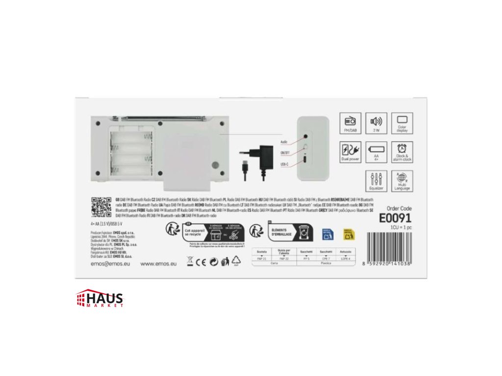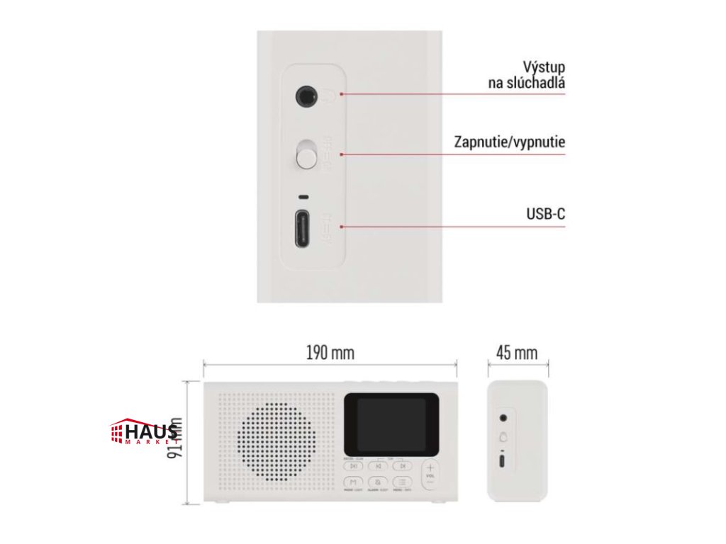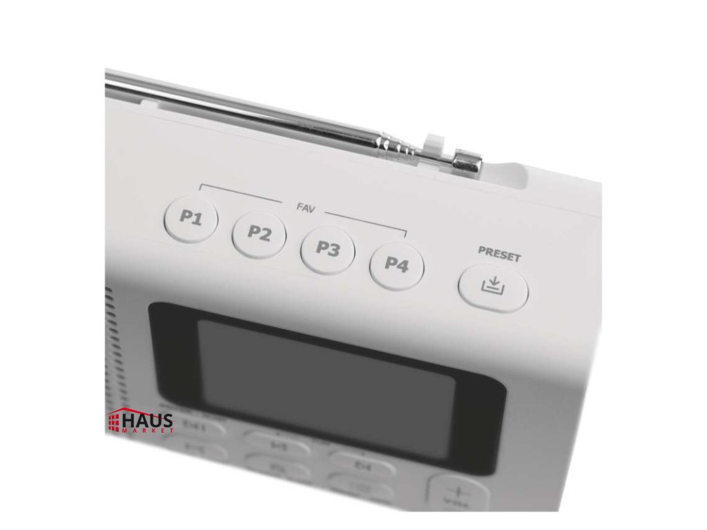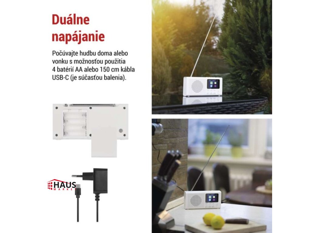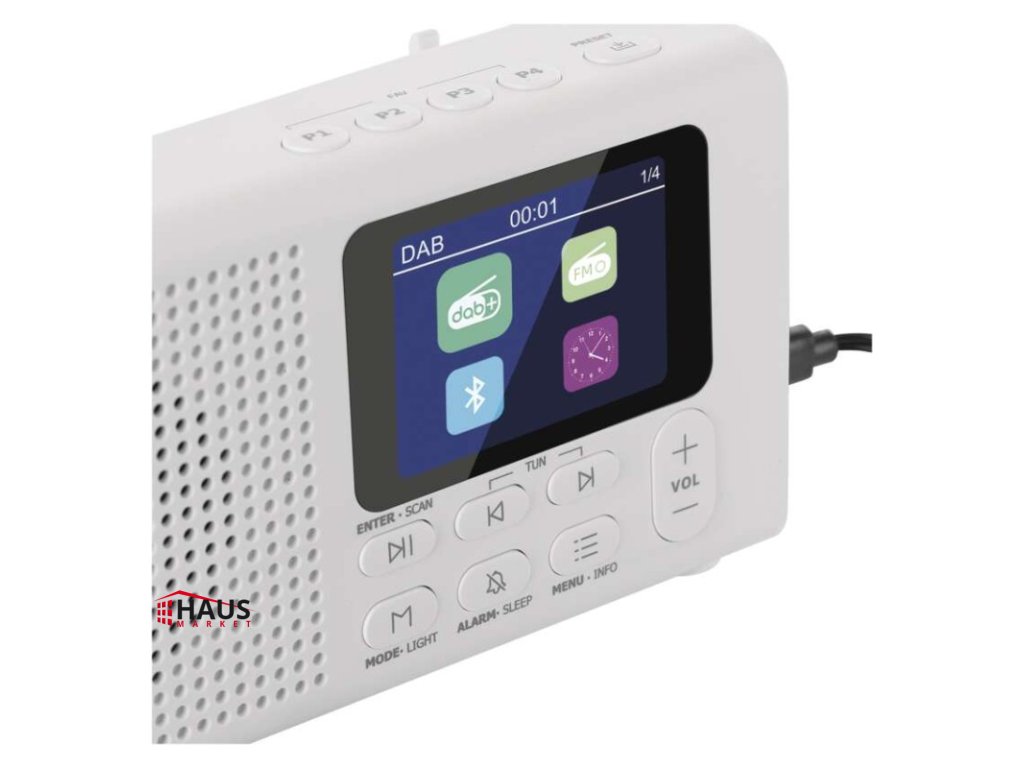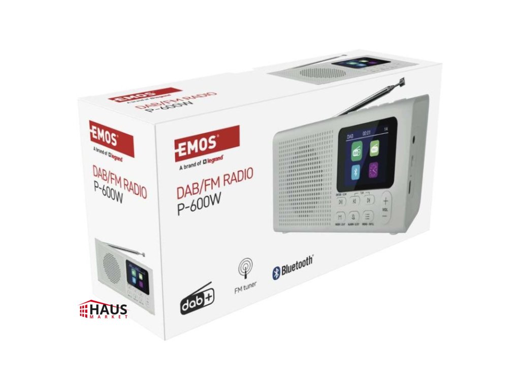 anténa: teleskopická anténa|bluetooth pre pripojenie napr. telefónu, tabletu: áno|displej: farebný displej 2,4" TFT|doba prevádzky na batériu: podľa použitých batérií|dosah bluetooth: 10 m|farba: biela|frekvencia tunera: 87,5–108 Mhz/174,9–239,2 Mhz|frekvenčný rozsah reproduktora: neuvádza sa|funkcia budíka: áno|funkcia handsfree: nie|hmotnosť: 337 g|integrovaný mikrofón: nie|napájací zdroj súčasťou dodávky: áno|napájanie: 4× AA 1,5 V (tužka)|odstup signálu/šum: neuvádza sa|podpora MP3: nie|potlačenie signálu: neuvádza sa|predajný obal: 1 ks, krabica|rádio: DAB/DAB+/FM|reproduktor: 50 mm/4 Ohm/3 W|rozmer: 190 × 91 × 45 mm|rozsah dekodéra MP3: neuvádza sa|typ batérie: AA (tužka)|USB vstup: nie|verzia bluetooth: 5.0|vstup AUX: nie|vstup pre microSD kartu: nie|výstup na slúchadlá: ánoDodatočné parametre