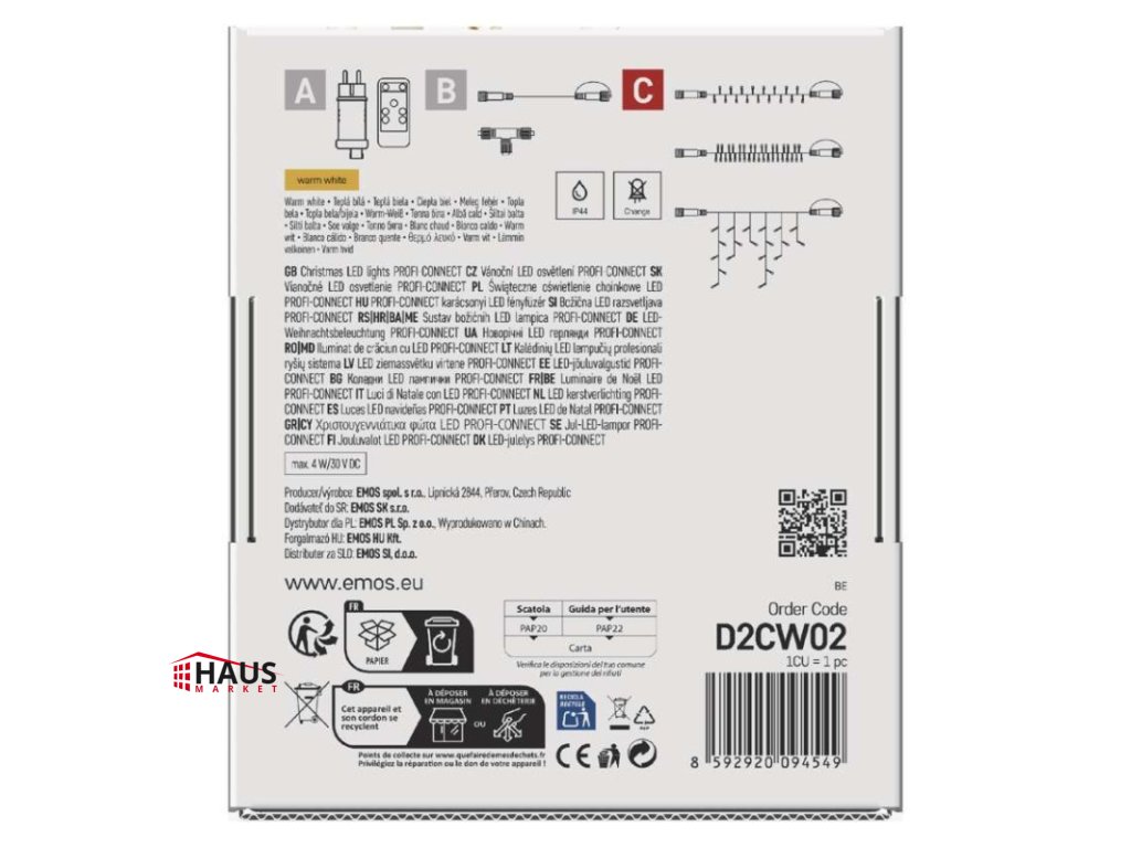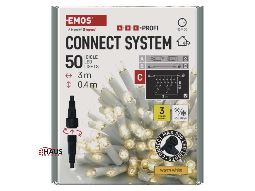 časovač: neuvádza sa|diaľkový ovládač: nie|dĺžka prívodu: 10 cm|farba drôtu: biela|farba svetla: teplá biela|funkcia: svieti|krytie: IP44|LED medzera: 10 cm|materiál: guma|možnosť prepojenia: áno|počet LED: 50|použitie: vonkajšie aj vnútorné|predajný obal: 1 ks, krabica|pre výšku stromu: neuvádza sa|príkon: max. 4 W|produkt: kvaple|rozmer: 3 × 0,4 m|tvar: klasický|typ napájania: sieťový adaptér (nie je súčasťou balenia)|veľkosť LED: 7 mm|vstupné napätie: 30 V DC|výstupné napätie: neuvádza sa|záručná doba: 3 roky|životnosť: 10 000 hodínDodatočné parametre