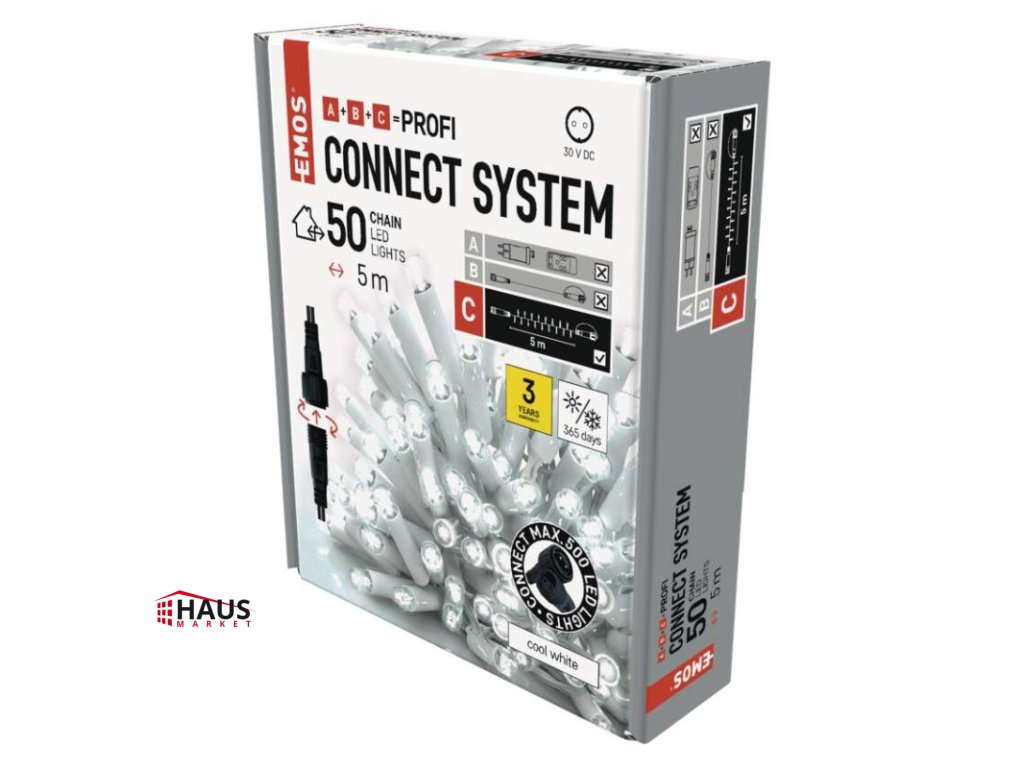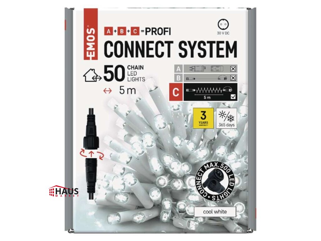 časovač: neuvádza sa|diaľkový ovládač: nie|dĺžka prívodu: 10 cm|farba drôtu: biela|farba svetla: studená biela|funkcia: svieti|krytie: IP44|LED medzera: 10 cm|materiál: guma|možnosť prepojenia: áno|počet LED: 50|použitie: vonkajšie aj vnútorné|predajný obal: 1 ks, krabica|pre výšku stromu: neuvádza sa|príkon: max. 4 W|produkt: reťaz|rozmer: 5 m|tvar: klasický|typ napájania: sieťový adaptér (nie je súčasťou balenia)|veľkosť LED: 7 mm|vstupné napätie: 30 V DC|výstupné napätie: neuvádza sa|záručná doba: 3 roky|životnosť: 10 000 hodínDodatočné parametre