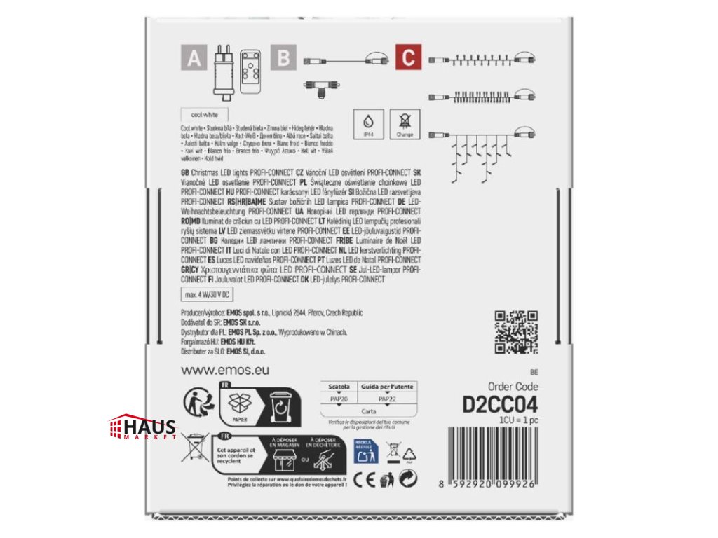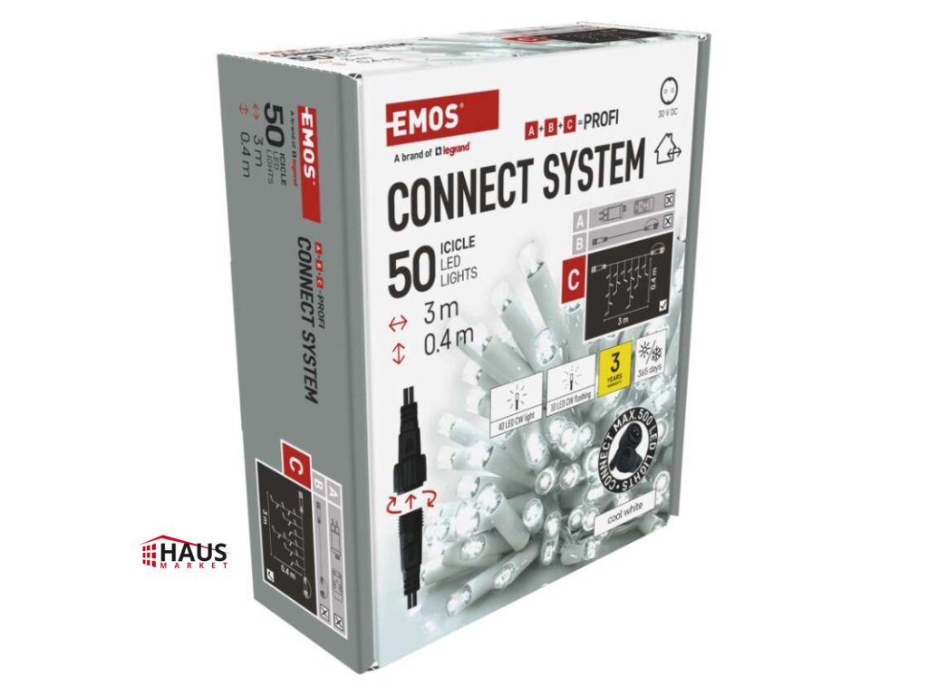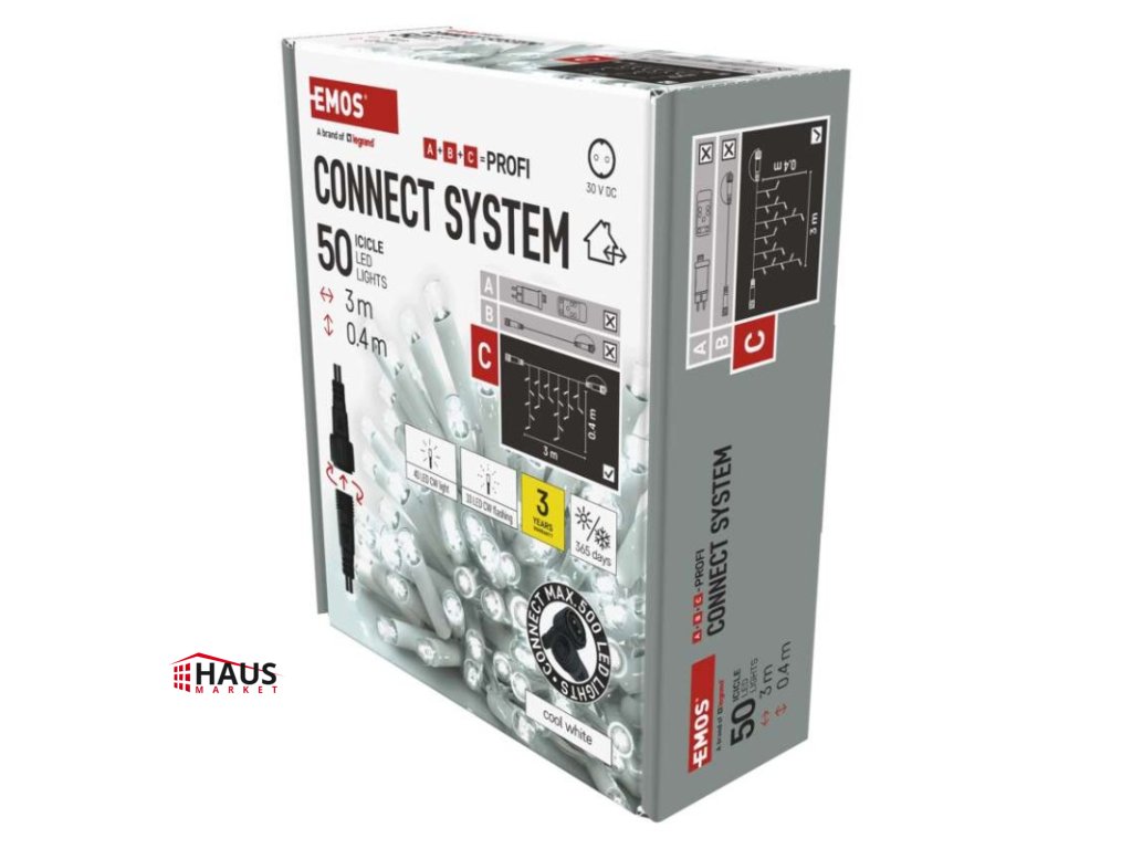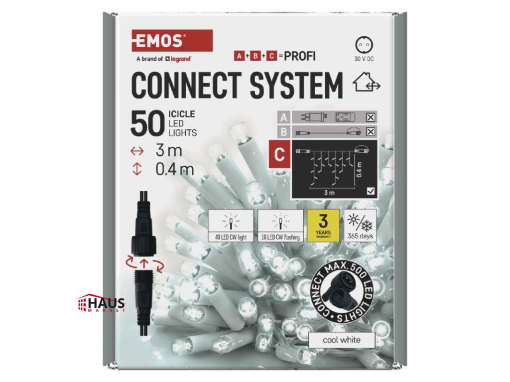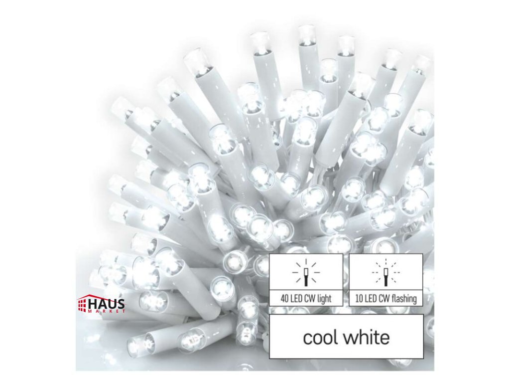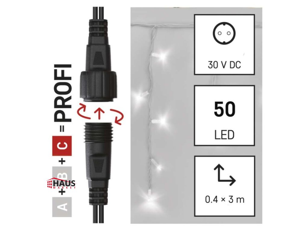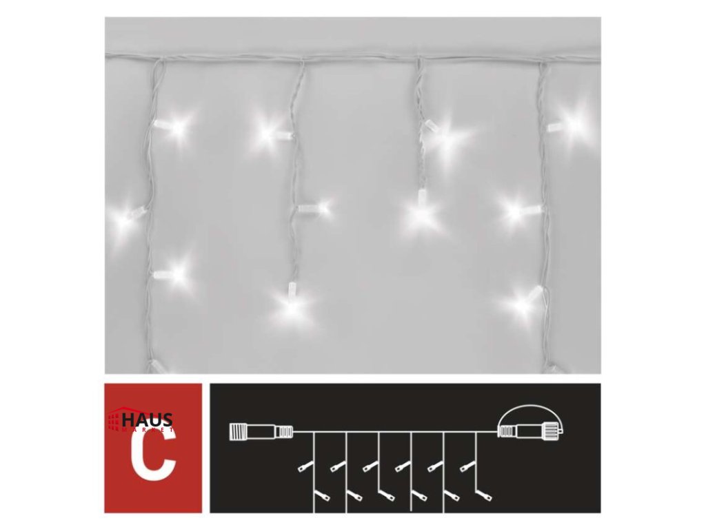 časovač: neuvádza sa|diaľkový ovládač: nie|dĺžka prívodu: 10 cm|farba drôtu: biela|farba svetla: studená biela|funkcia: svieti/bliká|krytie: IP44|LED medzera: 10 cm|materiál: guma|možnosť prepojenia: áno|počet LED: 50|použitie: vonkajšie aj vnútorné|predajný obal: 1 ks, krabica|pre výšku stromu: neuvádza sa|príkon: max. 4 W|produkt: kvaple|rozmer: 3 × 0,4 m|tvar: klasický|typ napájania: sieťový adaptér (nie je súčasťou balenia)|veľkosť LED: 7 mm|vstupné napätie: 30 V DC|výstupné napätie: neuvádza sa|záručná doba: 3 roky|životnosť: 10 000 hodínDodatočné parametre