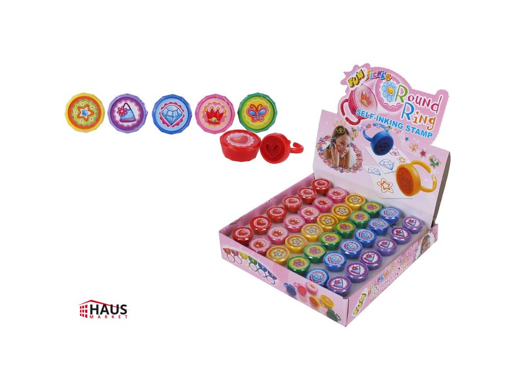 Detská, samonamáčacia, okrúhla pečiatka z plastu v tvare prstienka. Nakresli si obrázok a vyzdob ho pečiatkami! Samotlačiace pečiatky sú ideálne pre všetky kreatívne deti, ktoré si rady maľujú! Na prednom obale je vždy vyobrazený určitý obrázok. Pečiatky sú v rôznych farbách. Určené pre deti od 3 do 6 rokov. Varovanie: Slúži ako výtvarná pomôcka na potlač papiera. Používať pod dozorom dospelej osoby. Obal odstráňte z dosahu detí. Všetkých 36 ks je uložených v krabičke. Dodávame v mixe 6 ks podľa skladovej zásoby. Uvedená cena je za 1 ks.Dodatočné parametre