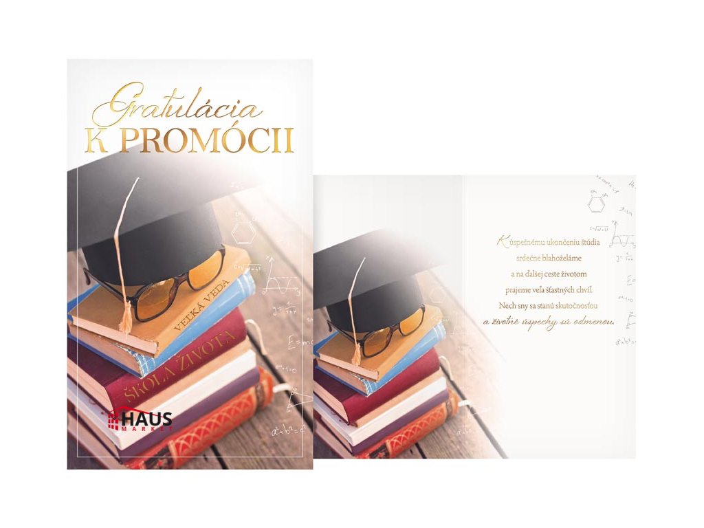 Blahoželanie k ukončeniu štúdia (promócii) s textom. Oslavy ukončenia štúdia patria k výnimočným a príjemným okamihom v živote. Venujte originálne a krásne prianie, ktoré bude pripomínať tento životný míľnik. Text na prednej strane: Gratulácia KPROMÓCII Text vo vnútri blahoželania: K úspešnému ukončeniu štúdia srdečne blahoželáme a na ďalšej ceste životom prajeme veľa šťastných chvíľ. Nech sny sa stanú skutočnosťou a životné úspechy sú odmenou. Papier: pohľadnicový kartón 240 g Želanie ja balené vo vrecúšku, súčasťou balenia je listová obálka. Uvedená cena je za 1 ks.Dodatočné parametre