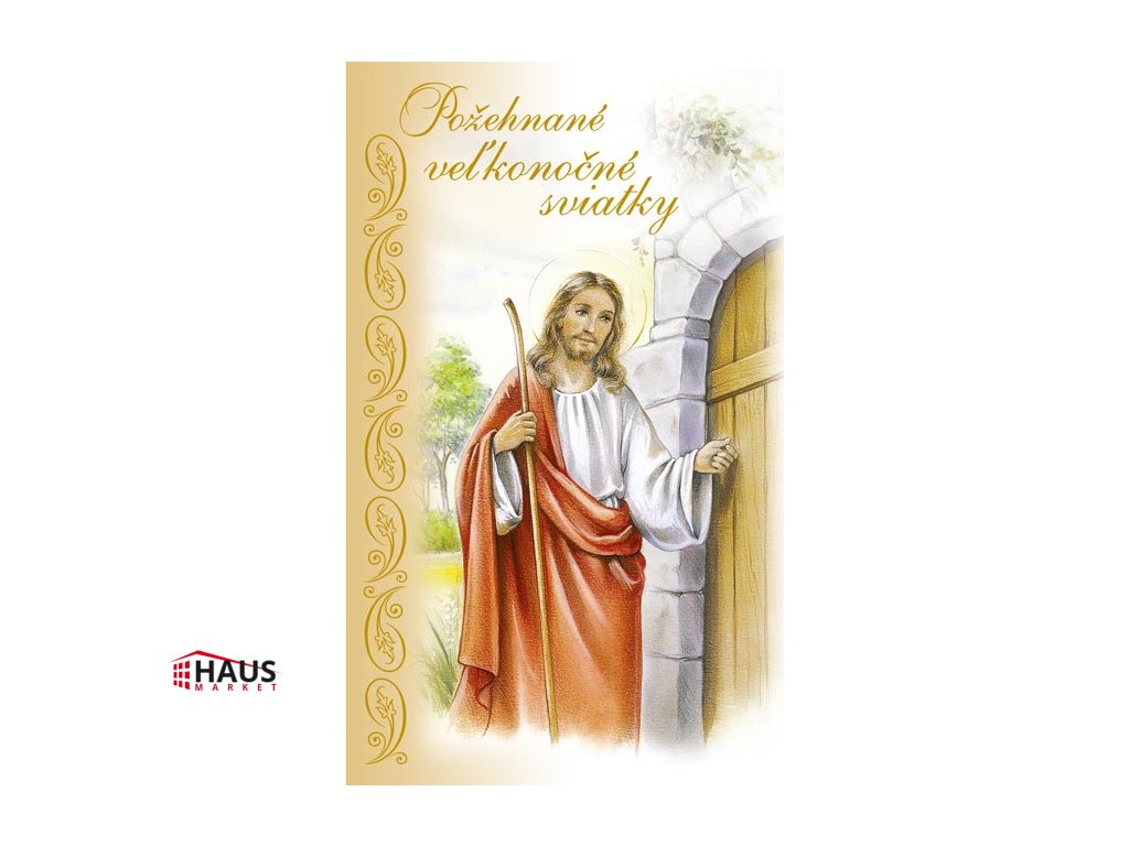 Blahoželanie veľká noc náboženské s textem. Potešte svojich blízkych vkusným prianiam a poprajte im krásne sviatky jari. Text na prednej strane pohľadnice: Požahnanú Veľkú noc, Požehnané Vel'konočné sviatky, Požahnanú Veľkú noc, Požahnanú Veľkú noc, Požahnanú Veľkú noc, Požahnanú Veľkú noc, Požehnané Vel'konočné sviatky Text vo vnútri: Bez textu Papier: pohľadnicový kartón 240 g Blahoželanie je balené vo vrecúšku, súčasťou je aj listová obálka. Blahoželania sa predávajú výhradne ako sada 5 ks – dodávame v mixe piatich motívov podľa aktuálnych skladových zásob. Uvedená cena je za 1 ks.Dodatočné parametre