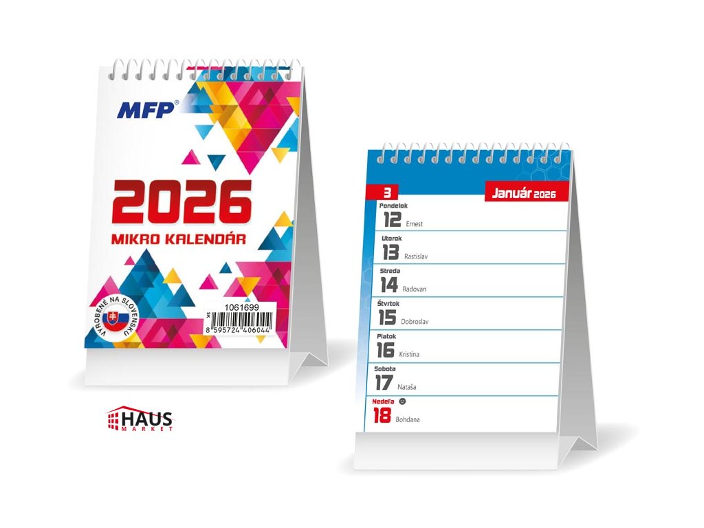 Stolový týždenný kalendár na rok 2026 s názvom Mikro. Vhodný na zapisovanie dôležitých poznámok a na organizovanie rôznych udalostí každodenného života. TYP KALENDÁRA: stolový OBRÁZKY: nie sú V KALENDÁRI NÁJDETE: - štátne sviatky, významné dni - priestor na poznámky - malý prehľad rokov 2026 a 2027 - plánovací kalendár na rok 2026 - meniny - názov mesiaca - slnovraty - počet týždňov Väzba: vinutá špirála Kalendárium: týždenné Uvedená cena je za 1 ks.Dodatočné parametre