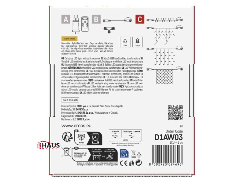 časovač: neuvádza sa|diaľkový ovládač: nie|dĺžka prívodu: 10 cm|farba drôtu: čierna|farba svetla: teplá biela|funkcia: svieti|krytie: IP44|LED medzera: 10 cm|materiál: PVC|možnosť prepojenia: áno|počet LED: 100|použitie: vonkajšie aj vnútorné|predajný obal: 1 ks, krabica|pre výšku stromu: neuvádza sa|príkon: max. 5 W|produkt: reťaz|rozmer: 10 m|tvar: klasický|typ napájania: sieťový adaptér (nie je súčasťou balenia)|veľkosť LED: 5 mm|vstupné napätie: 30 V DC|výstupné napätie: neuvádza sa|záručná doba: 2 roky|životnosť: 10 000 hodínDodatočné parametre
