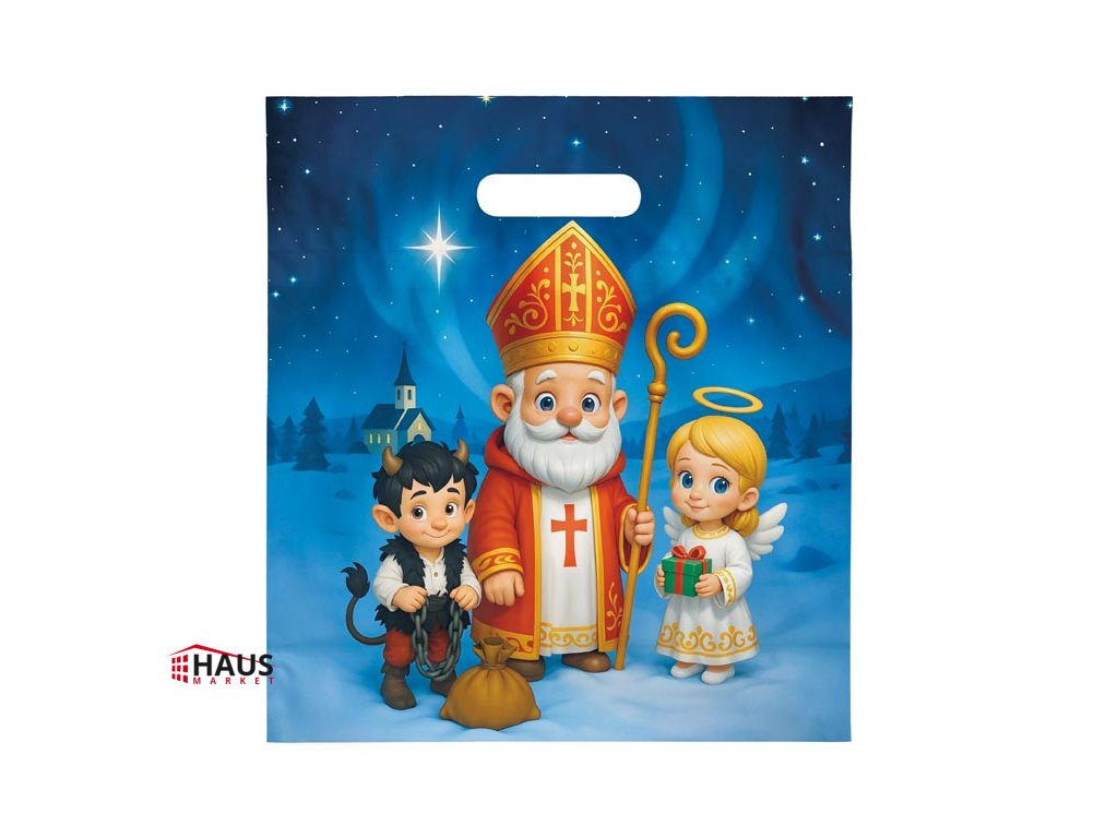 Mikulášska nádielka má byť plná radosti – a presne o to sa postará taška MFP s motívom Mikuláša, anjela a čerta. Krásne ilustrovaný obrázok pôsobí ako z rozprávky a deťom okamžite vyčarí úsmev na tvári. A to nie je všetko. Vďaka svojej veľkosti taška pojme poriadnu mikulášsku nádielku – od čokolád a perníkov cez ovocie až po malé hračky. Nemusíte sa trápiť s baliacim papierom, pretože krásny motív tašky urobí parádu sám o sebe. Materiál: PE Rozmer: 290 × 320 × 80 mm Praktické balenie: odtrhávací blok Uvedená cena je za 1 ks.Dodatočné parametre