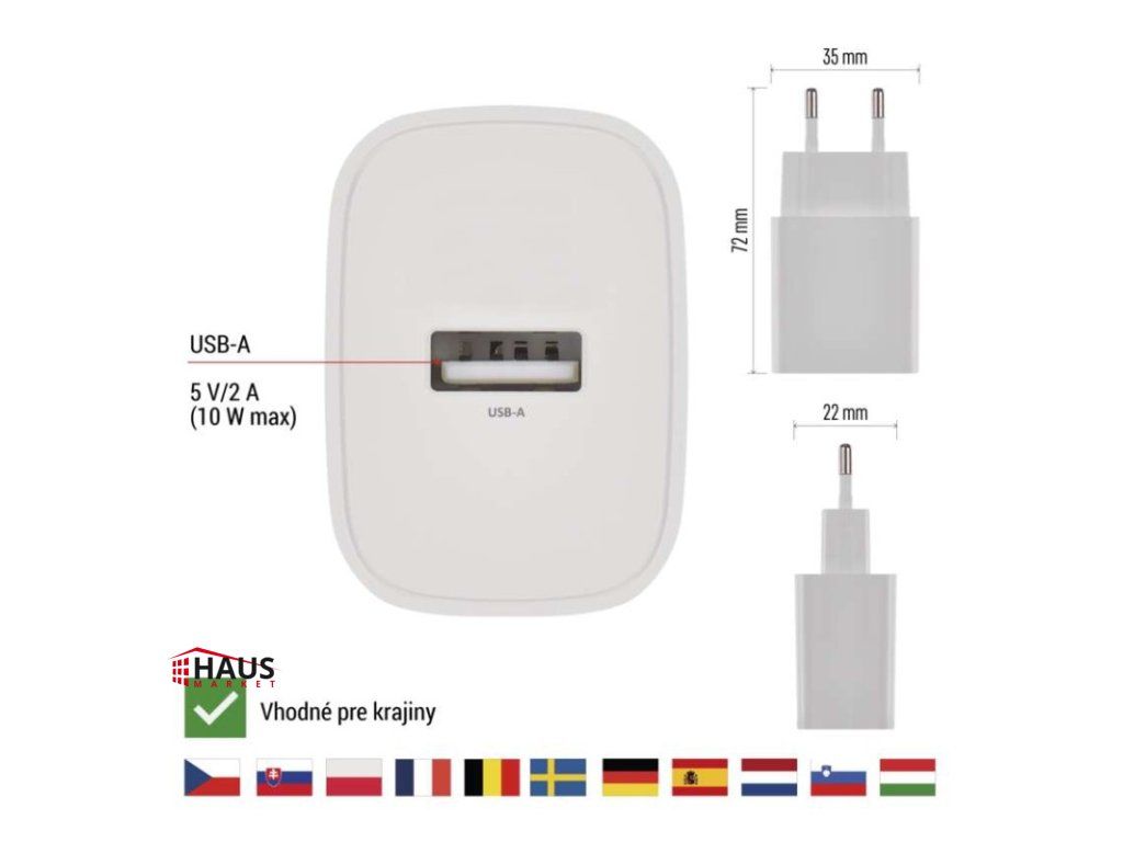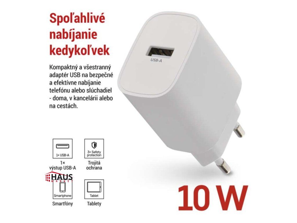 farba: biela|funkcia LED svietidla: neuvádza sa|hmotnosť: 40 g|kábel: nie|kapacita akumulátora: neuvádza sa|kľudový odber prúdu: neuvádza sa|LED indikácia: nie|LED indikátor nabíjania: neuvádza sa|LED indikátor stavu batérie: neuvádza sa|max. výstup 1× USB: A: 5 V/2 A (10 W)|max. výstup celkom: 10 W|max. zaťaženie – stále: neuvádza sa|max. zaťaženie – v špičke: neuvádza sa|nabíjací: basic|ochrana proti preťaženiu, prepätiu a skratu: áno|počet USB výstupov: 1|predajný obal: 1 ks, papierová krabička|produkt: USB adaptér|rozmer: 35 × 72 × 22 mm|rozmer konektora: neuvádza sa|typ batérie: neuvádza sa|typ napájania: neuvádza sa|určené pre: smartphone|vstupné napätie: 100–240 V~ 50/60 Hz|výstupné napätie: neuvádza sa|výstupný prúd: neuvádza saDodatočné parametre