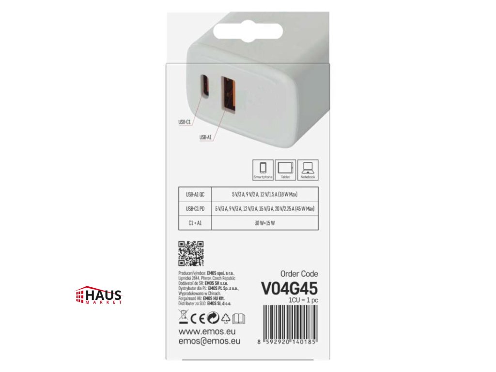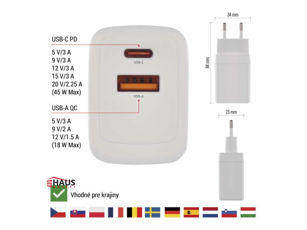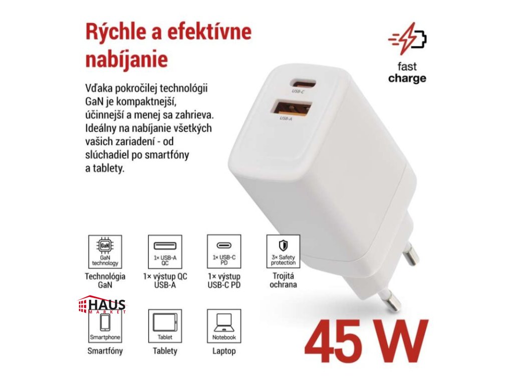farba: biela|funkcia LED svietidla: neuvádza sa|hmotnosť: 79 g|kábel: nie|kapacita akumulátora: neuvádza sa|kľudový odber prúdu: neuvádza sa|LED indikácia: nie|LED indikátor nabíjania: neuvádza sa|LED indikátor stavu batérie: neuvádza sa|max. výstup 1× USB: A: 5 V/3 A – 9 V/2 A – 12 V/1,5 A (18 W); C: 5 V/3 A – 9 V/3 A – 12 V/3 A – 15 V/3 A – 20 V/2,25 A (45 W)|max. výstup celkom: 45 W|max. zaťaženie – stále: neuvádza sa|max. zaťaženie – v špičke: neuvádza sa|nabíjací: fast|ochrana proti preťaženiu, prepätiu a skratu: áno|počet USB výstupov: 2|predajný obal: 1 ks, papierová krabička|produkt: USB adaptér|rozmer: 34 × 84 × 23 mm|rozmer konektora: neuvádza sa|typ batérie: neuvádza sa|typ napájania: neuvádza sa|určené pre: smartphone, tablet, notebook|vstupné napätie: 100–240 V~ 50/60 Hz|výstupné napätie: neuvádza sa|výstupný prúd: neuvádza saDodatočné parametre