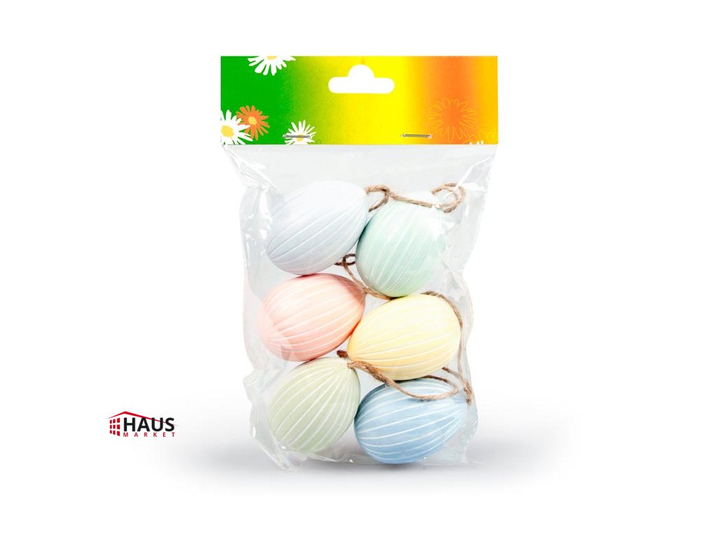 Veľkonočné plastové vajíčka s vrúbkami v zmesi pastelových farieb. Vyzdobte si domov krásnymi veľkonočnými vajíčkami, ktoré vytvoria očarujúcu veľkonočnú atmosféru! Túto dekoráciu môžete použiť na ozdobenie veľkonočných vencov alebo vetvičiek. Vajíčka majú šnúrku na zavesenie. Balenie obsahuje: - 6 ks plastových vajíčok Veľkosť: 6 cm Farba: 2 x zelená, modrá, žltá, oranžová, biela Dodávame vo vrecku so závesom. Uvedená cena je za 1 balenie.Dodatočné parametre