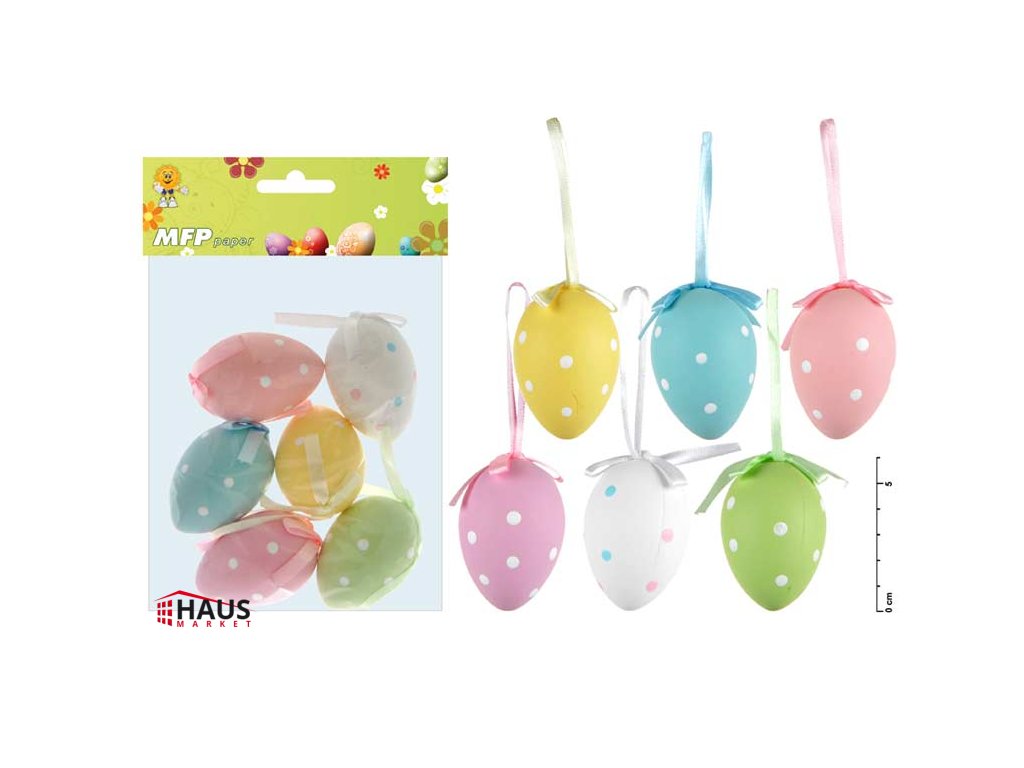 Veľkonočné plastové vajíčka s bodkami. Vajíčka majú stužku na zavesenie. Vyzdobte si svoj domov krásnymi veľkonočnými vajíčkami, ktoré Vám vytvoria očarujúcu atmosféru Veľkej noci! Túto dekoráciu môžete použiť na dekorovanie veľkonočných vencov alebo vetvičiek. BALENIE OBSAHUJE: - 6 ks plastových vajíčok Veľkosť: 60 mm Farba: žltá, modrá, ružová, fialová, biela, zelená Dodávame v sáčku so závesom. Uvedená cena je za 1 balenie.Dodatočné parametre