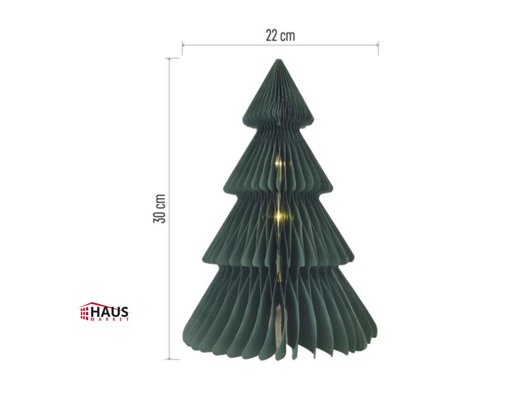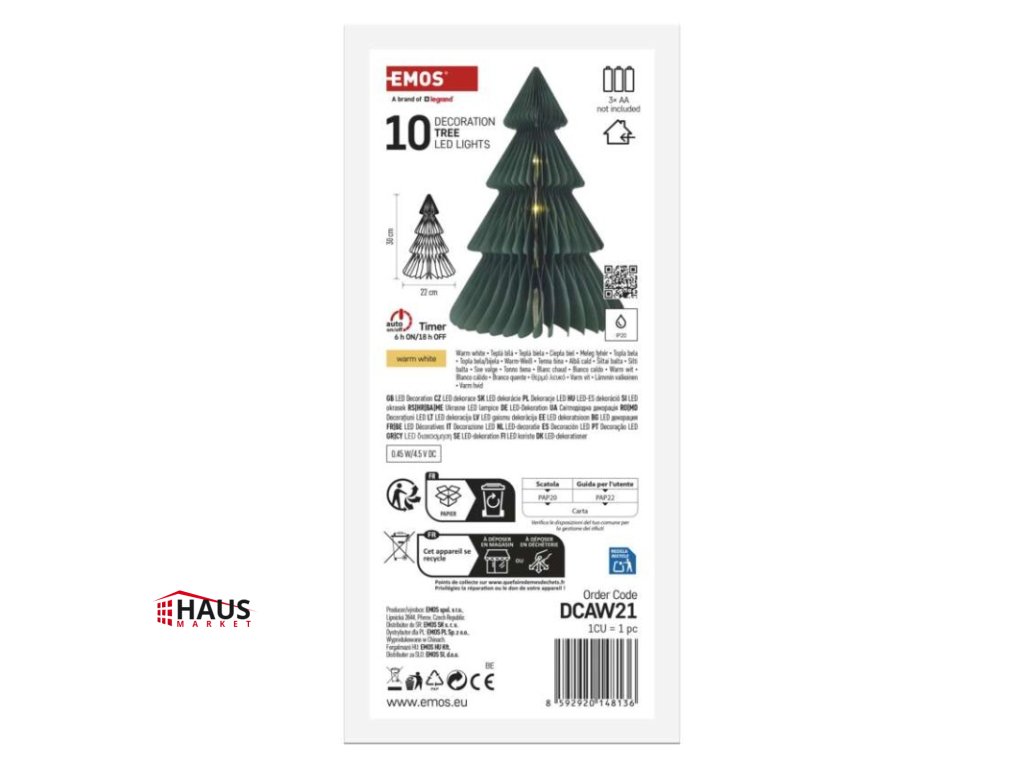 časovač: áno|diaľkový ovládač: nie|dĺžka prívodu: –|farba drôtu: –|farba svetla: teplá biela|krytie: IP20|materiál: papier|počet LED: 10|použitie: vnútorné|predajný obal: 1 ks, krabica|príkon: 0,45 W|produkt: stromček|rozmer: 22 × 22 × 30 cm|typ napájania: batéria 3× AA (nie je súčasťou balenia)|vstupné napätie: –|výstupné napätie: 4,5 V DC|záručná doba: 2 roky|zdroj svetla: LED|životnosť: 10 000 hodínDodatočné parametre