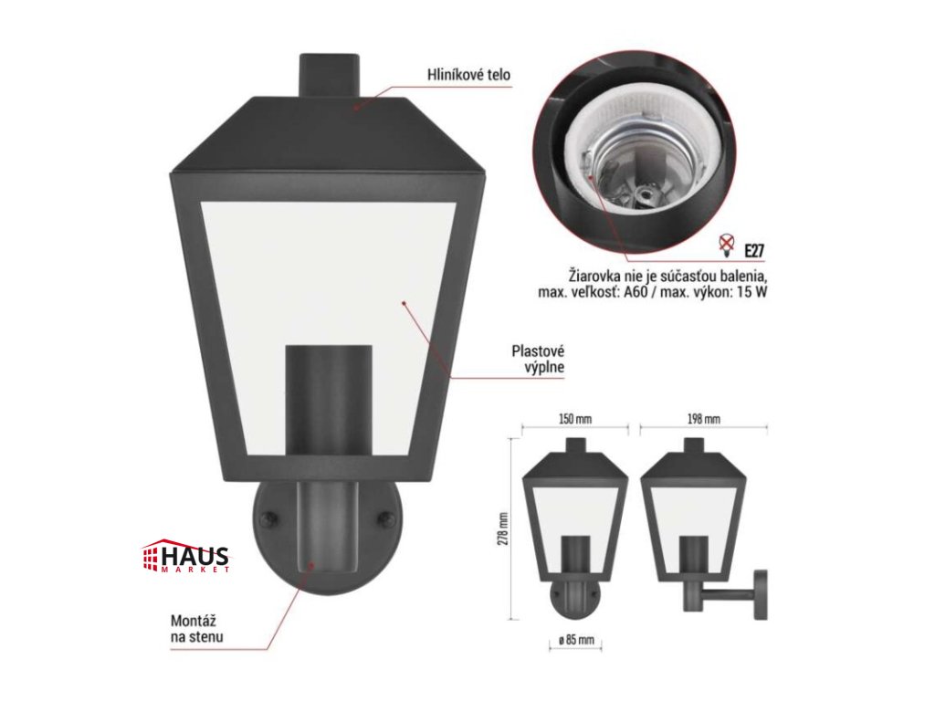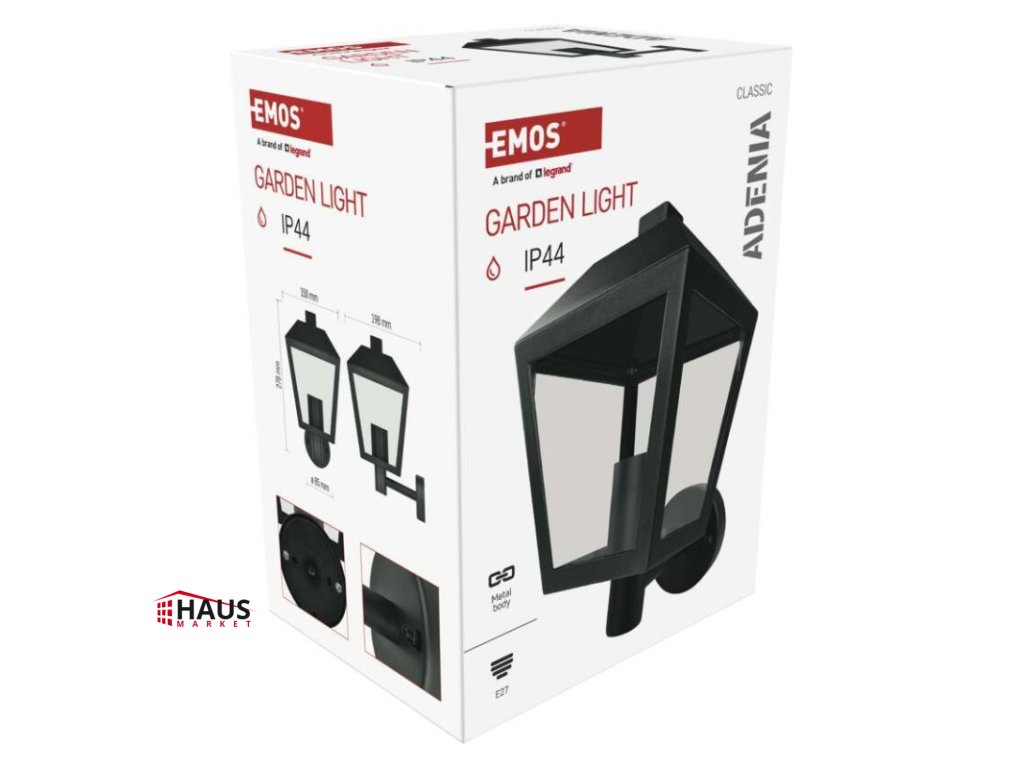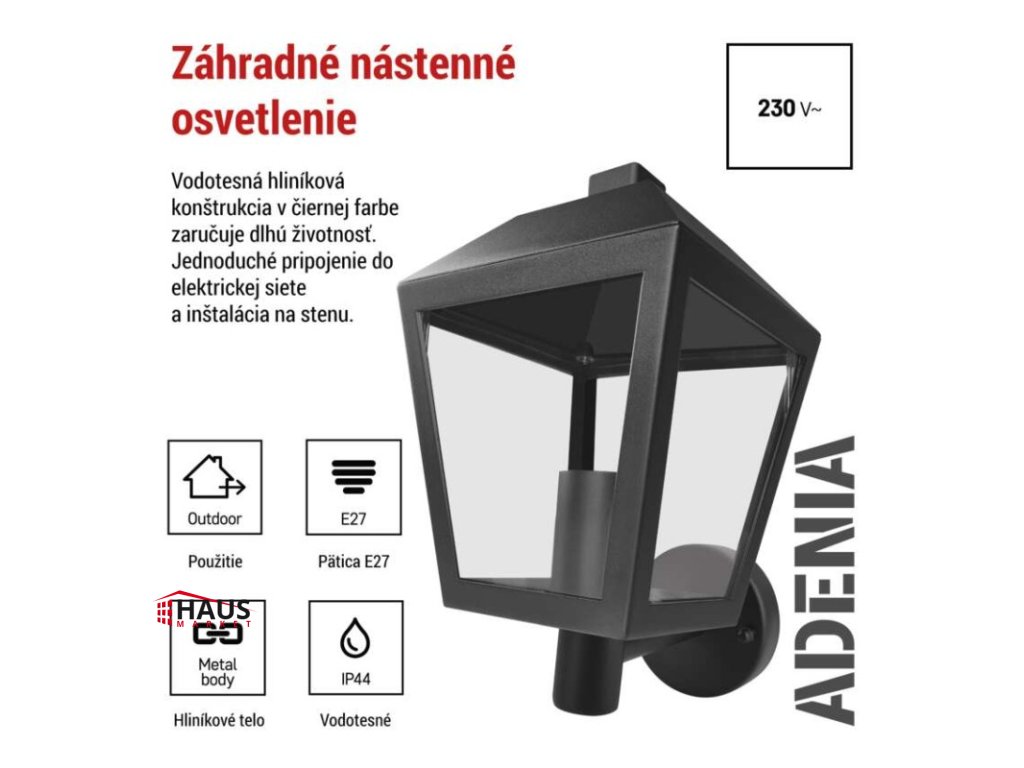 energetická trieda použitého zdroja svetla: –|farba: čierna|farba svetla: –|fotovoltaický článok: nie|frekvencia: 50/60 Hz|index podania farieb (CRI): –|kategória: CLASSIC|krytie: IP44|materiál: hliník|materiál difúzora: plast|napájanie: 230 V AC|napätie: 220-240 V~|pätica (uchytenie žiarovky): E27|predajný obal: 1 ks, krabička|príkon: –|rada: ADENIA|rozmer: 198 × 150 × 278 mm|rozsah pracovnej teploty: -20 ~ +40 °C|Rozsah snímača PIR: –|senzor PIR: Nie|súmrakový spínač: nie|svetelný tok: –|teplota chromatičnosti: –|vstavaný vypínač: nie|zdroj svetla: –|žiarovka súčasťou balenia: nie|životnosť: –Dodatočné parametre