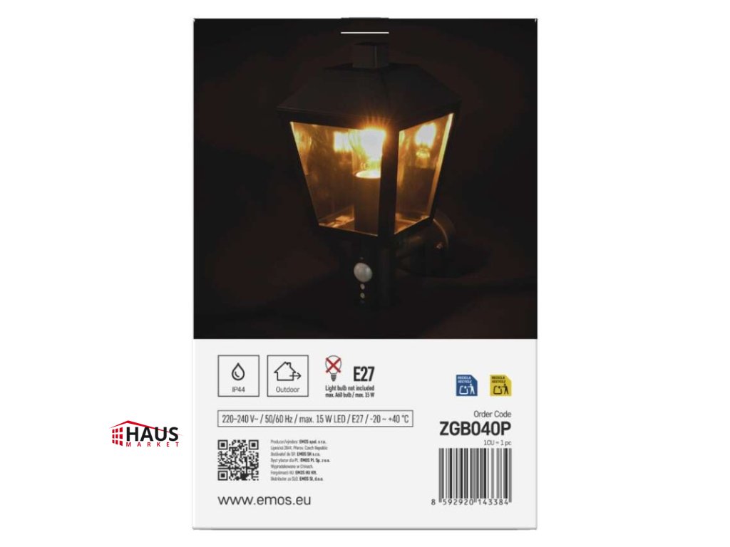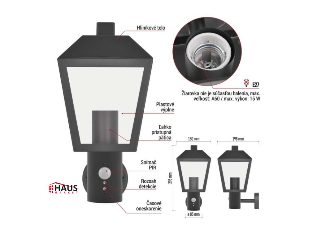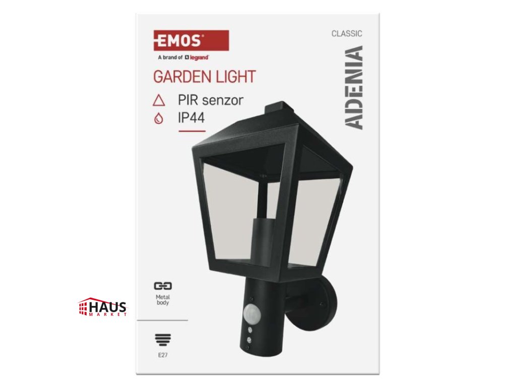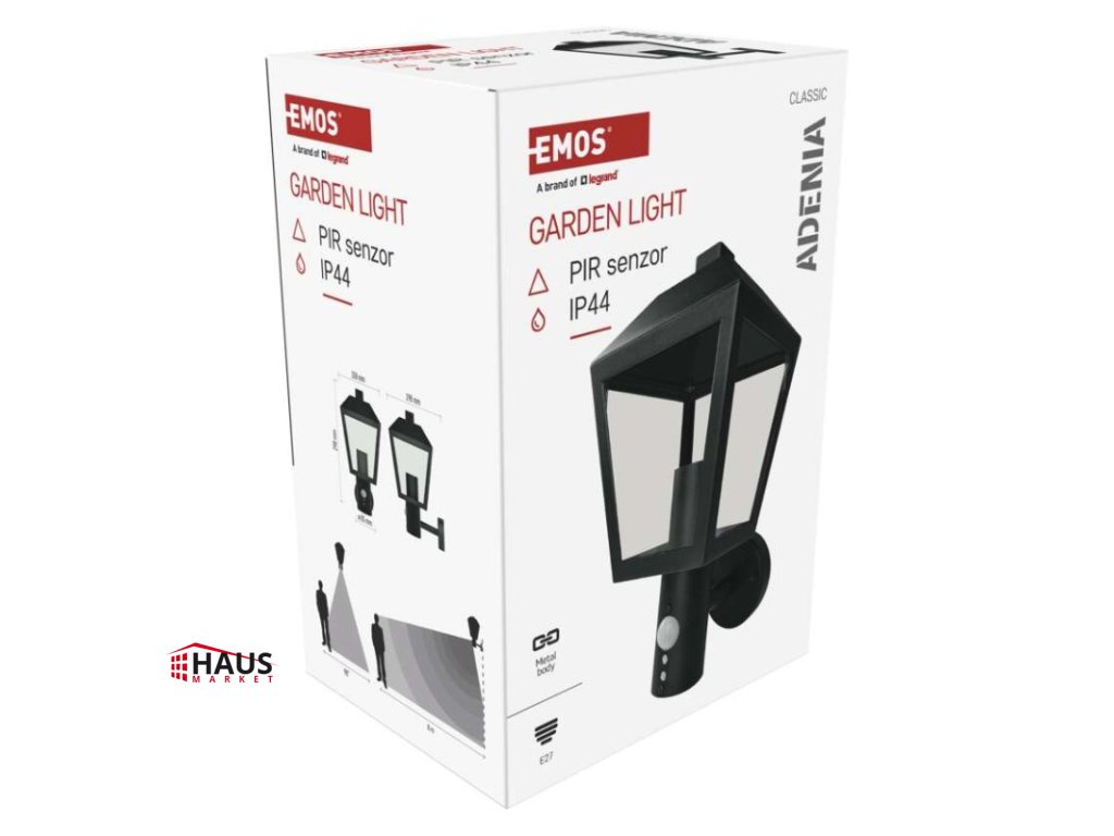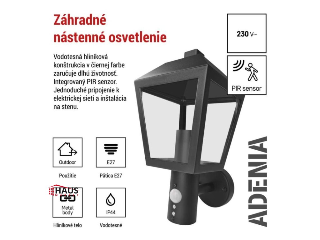 energetická trieda použitého zdroja svetla: –|farba: čierna|farba svetla: –|fotovoltaický článok: nie|frekvencia: 50/60 Hz|index podania farieb (CRI): –|kategória: CLASSIC|krytie: IP44|materiál: hliník|materiál difúzora: plast|napájanie: 230 V AC|napätie: 220-240 V~|pätica (uchytenie žiarovky): E27|predajný obal: 1 ks, krabička|príkon: –|rada: ADENIA|rozmer: 198 × 150 × 298 mm|rozsah pracovnej teploty: -20 ~ +40 °C|Rozsah snímača PIR: 8 m|senzor PIR: áno|súmrakový spínač: áno|svetelný tok: –|teplota chromatičnosti: –|vstavaný vypínač: nie|zdroj svetla: –|žiarovka súčasťou balenia: nie|životnosť: –Dodatočné parametre