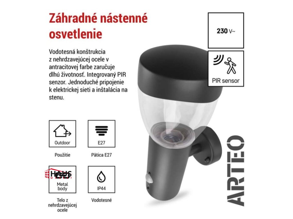 energetická trieda použitého zdroja svetla: –|farba: antracit|farba svetla: –|fotovoltaický článok: nie|frekvencia: 50/60 Hz|index podania farieb (CRI): –|kategória: CLASSIC|krytie: IP44|materiál: nehrdzavejúca oceľ|materiál difúzora: plast|napájanie: 230 V AC|napätie: 220-240 V~|pätica (uchytenie žiarovky): E27|predajný obal: 1 ks, krabička|príkon: –|rada: ARTEO|rozmer: 164 × 120 × 295 mm|rozsah pracovnej teploty: -20 ~ +40 °C|Rozsah snímača PIR: 8 m|senzor PIR: áno|súmrakový spínač: áno|svetelný tok: –|teplota chromatičnosti: –|vstavaný vypínač: nie|zdroj svetla: –|žiarovka súčasťou balenia: nie|životnosť: –Dodatočné parametre