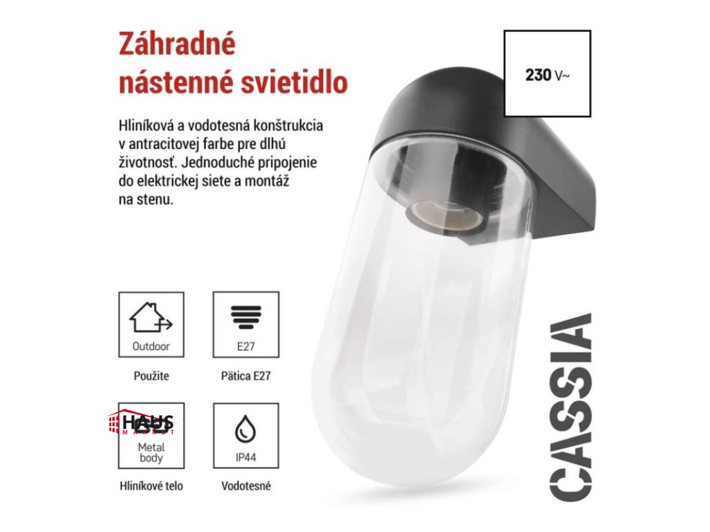 energetická trieda použitého zdroja svetla: –|farba: antracit|farba svetla: –|fotovoltaický článok: nie|frekvencia: 50/60 Hz|index podania farieb (CRI): –|kategória: CLASSIC|krytie: IP44|materiál: hliník|materiál difúzora: sklo|napájanie: 230 V AC|napätie: 220-240 V~|pätica (uchytenie žiarovky): E27|predajný obal: 1 ks, krabička|príkon: –|rada: CASSIA|rozmer: 126 × 95 × 222 mm|rozsah pracovnej teploty: -20 ~ +40 °C|Rozsah snímača PIR: –|senzor PIR: Nie|súmrakový spínač: nie|svetelný tok: –|teplota chromatičnosti: –|vstavaný vypínač: nie|zdroj svetla: –|žiarovka súčasťou balenia: nie|životnosť: –Dodatočné parametre