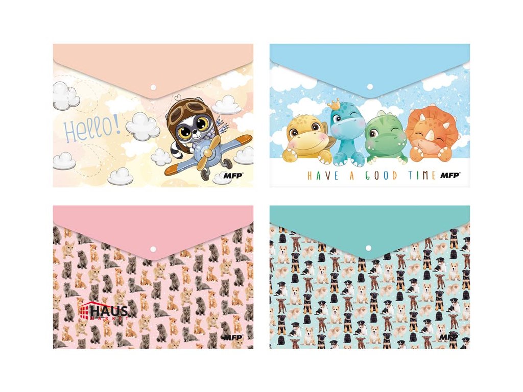 Zložka z PolyPropylénu, ktorá sa zatvára pomocou cvoku vo formáte A4, s detskou potlačou, v pastelových farbách. Zložka slúži ako pomocník na triedenie a ukladanie dokumentov, takže ich budete mať vždy pohromade. MATERIÁL: PP SILA MATERIÁLU: 0,21 mm FARBA: oranžová, modrá, ružová, tyrkysová POTLAČ: lietadlo, dinosaury, mačiatka, šteniatka Dodávame v mixe po 4 ks podľa skladovej zásoby. Uvedená cena je za 1 ks.Dodatočné parametre