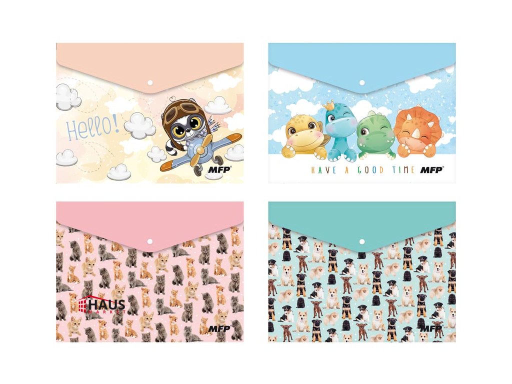 Zložka z PolyPropylénu, ktorá sa zatvára pomocou cvoku vo formáte A5, s detskou potlačou, v pastelových farbách. Zložka slúži ako pomocník na triedenie a ukladanie dokumentov, takže ich budete mať vždy pohromade. MATERIÁL: PP SILA MATERIÁLU: 0,21 mm FARBA: oranžová, modrá, ružová, tyrkysová POTLAČ: lietadlo, dinosaury, mačiatka, šteniatka Dodávame v mixe po 4 ks podľa skladovej zásoby. Uvedená cena je za 1 ks.Dodatočné parametre