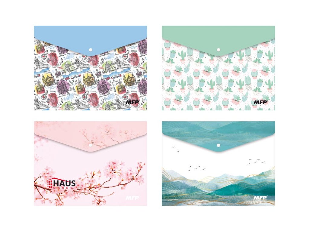 Zložka z PolyPropylénu, ktorá sa zatvára pomocou cvoku, vo formáte A5. Zložka slúži ako pomocník na triedenie a ukladanie dokumentov, takže ich budete mať vždy pohromade. MATERIÁL: PP SILA MATERIÁLU: 0,21 mm POTLAČ: Londýn, kaktusy, kvety, vlny Dodávame v mixe po 4 ks podľa skladovej zásoby. Uvedená cena je za 1 ks.Dodatočné parametre