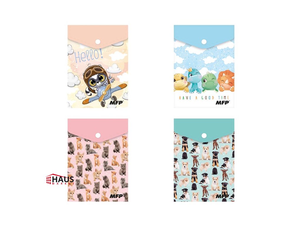 Zložka z PolyPropylénu, ktorá sa zatvára pomocou cvoku vo formáte A6, s detskou potlačou, v pastelových farbách. Zložka slúži ako pomocník na triedenie a ukladanie dokumentov, takže ich budete mať vždy pohromade. MATERIÁL: PP SILA MATERIÁLU: 0,21 mm FARBA: oranžová, modrá, ružová, tyrkysová POTLAČ: lietadlo, dinosaury, mačiatka, šteniatka Dodávame v mixe po 4 ks podľa skladovej zásoby. Uvedená cena je za 1 ks.Dodatočné parametre