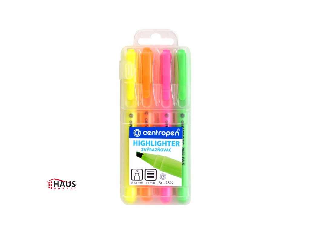 Set 4 ks zvýrazňovačov v praktickom plastovom obale. Fluorescenčný atrament, klinový hrot, ktorý vytvorí stopu písma šírky 1-3 mm, vhodný nielen pre všetky druhy bežných papierov, ale aj na papiere kopírovacie a faxové, odolnosť proti vyschnutiu je min. 3 roky. Uvedená cena je za 1 balenie.Dodatočné parametre